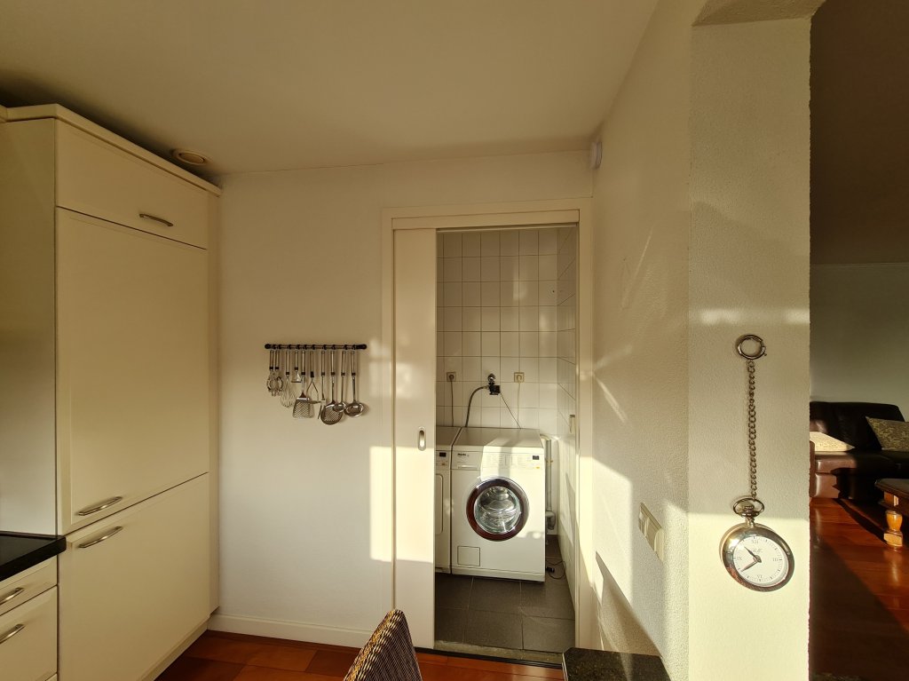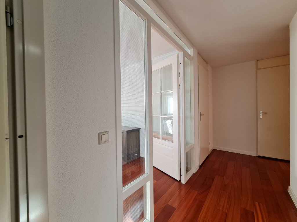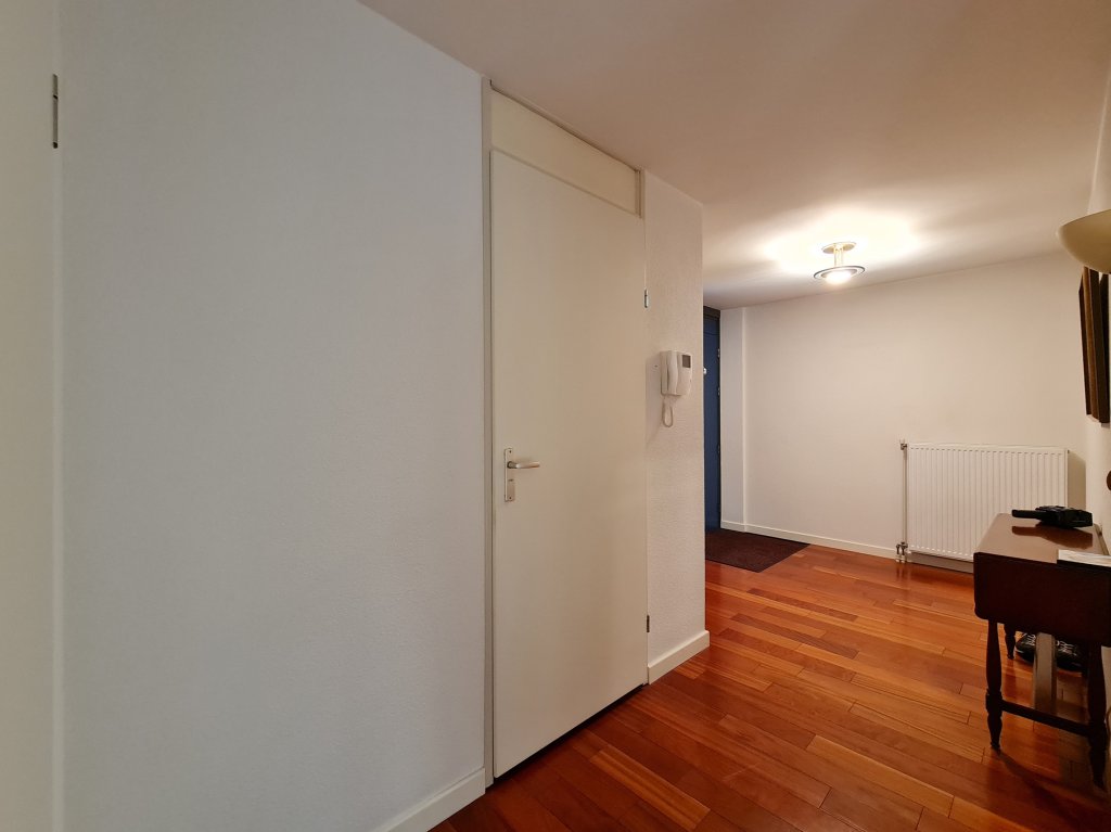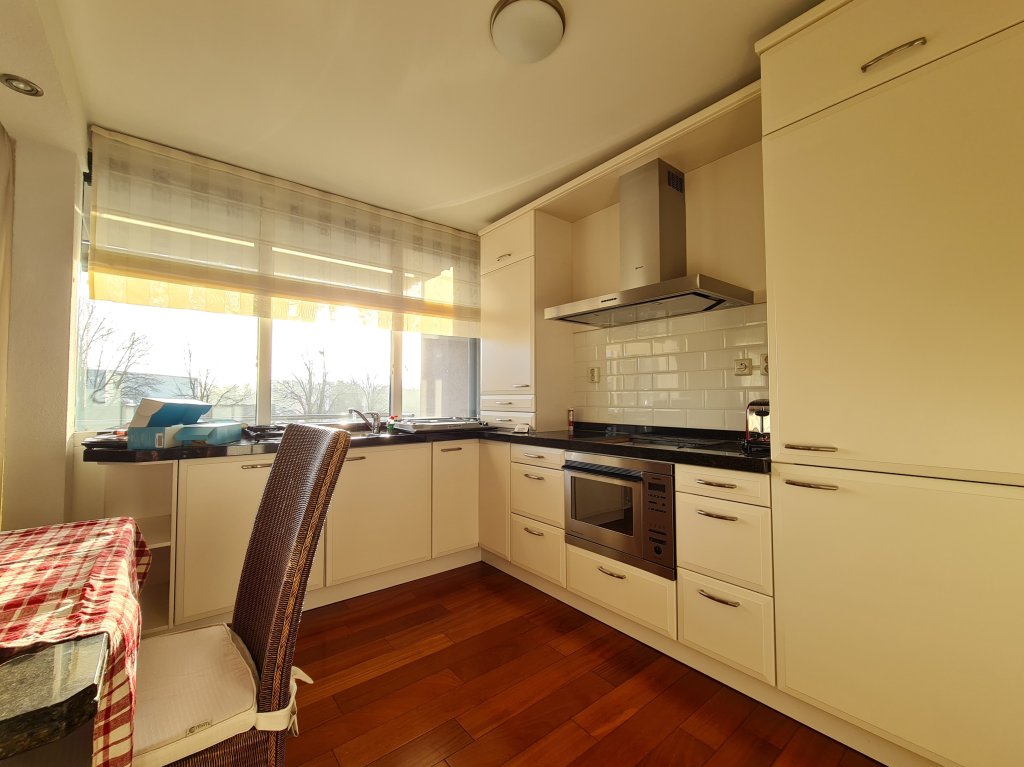 Royale en lichte woonkamer voorzien van massief houten parketvloer en extra zijraam. Heerlijk zonnig balkon voorzien van houten vlonders en elektrisch zonneluifel. Open keuken met keukenblok in hoekopstelling met diverse inbouwapparatuur zoals oven, koelkast, vriezer, inductie-kookplaat, afzuigkap en vaatwasser. Aansluitend een praktische bijkeuken met aansluiting voor de wasmachine en/of –droger en opstelling van de cv-ketel.