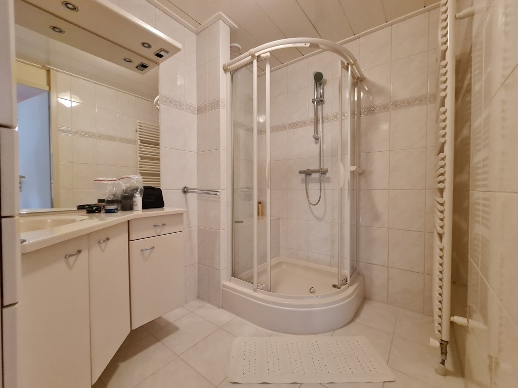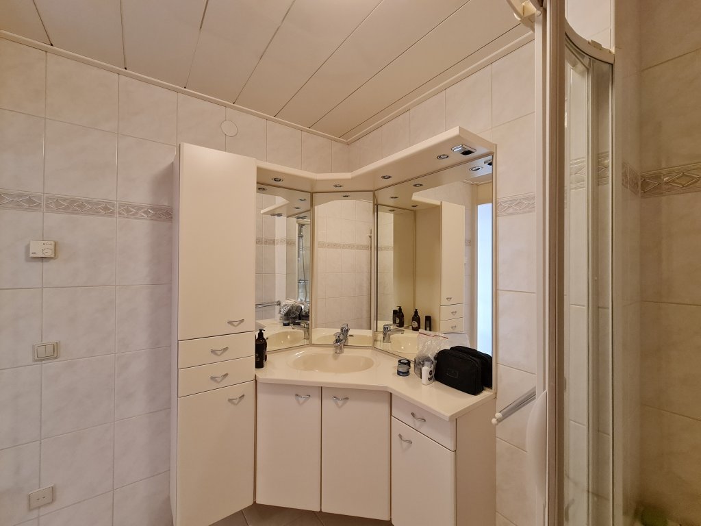 Geheel betegelde badkamer voorzien van instapdouche en vast wasmeubel met bergruimte en spiegelwand.