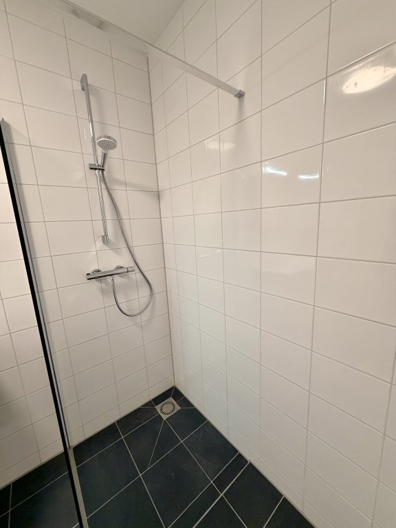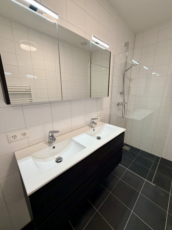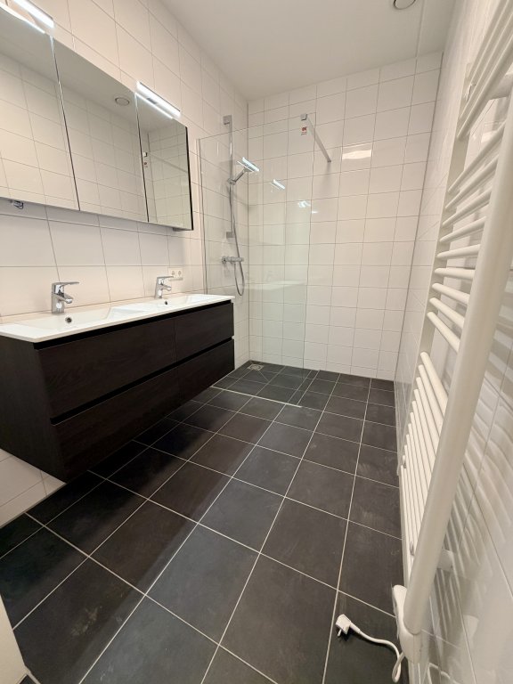 - De badkamer beschikt over een inloopdouche, dubbele wastafel en een elektrische radiator.