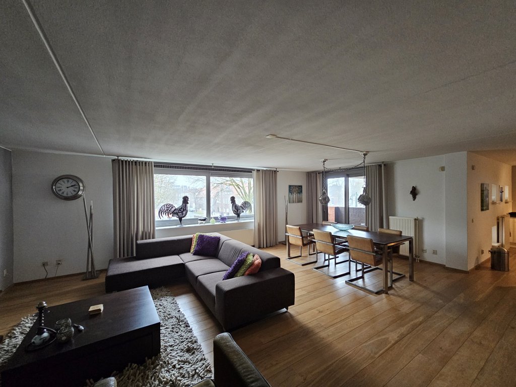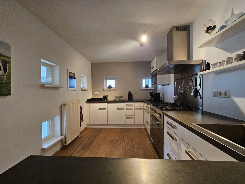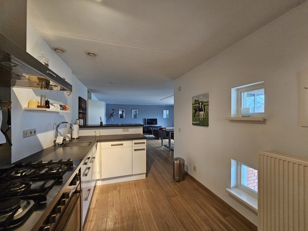 In de hal treft u de toiletruimte, meterkast en installatieruimte aan met ruimte waar de wasmachine en wasdroger aanwezig zijn. De woonkamer is bijzonder ruim en er komt voldoende daglicht binnen door de aanwezige raampartijen. Door het hoge plafond, de lichte wanden, moderne verlichting en de lichte laminaatvloer is het een aangename ruimte. De open keuken is in een U-opstelling geplaatst met een ontbijtbar, u kunt gebruik maken van een 5-pits gasfornuis, afzuigkap, combi-oven, koelkast, diepvries en vaatwasmachine.