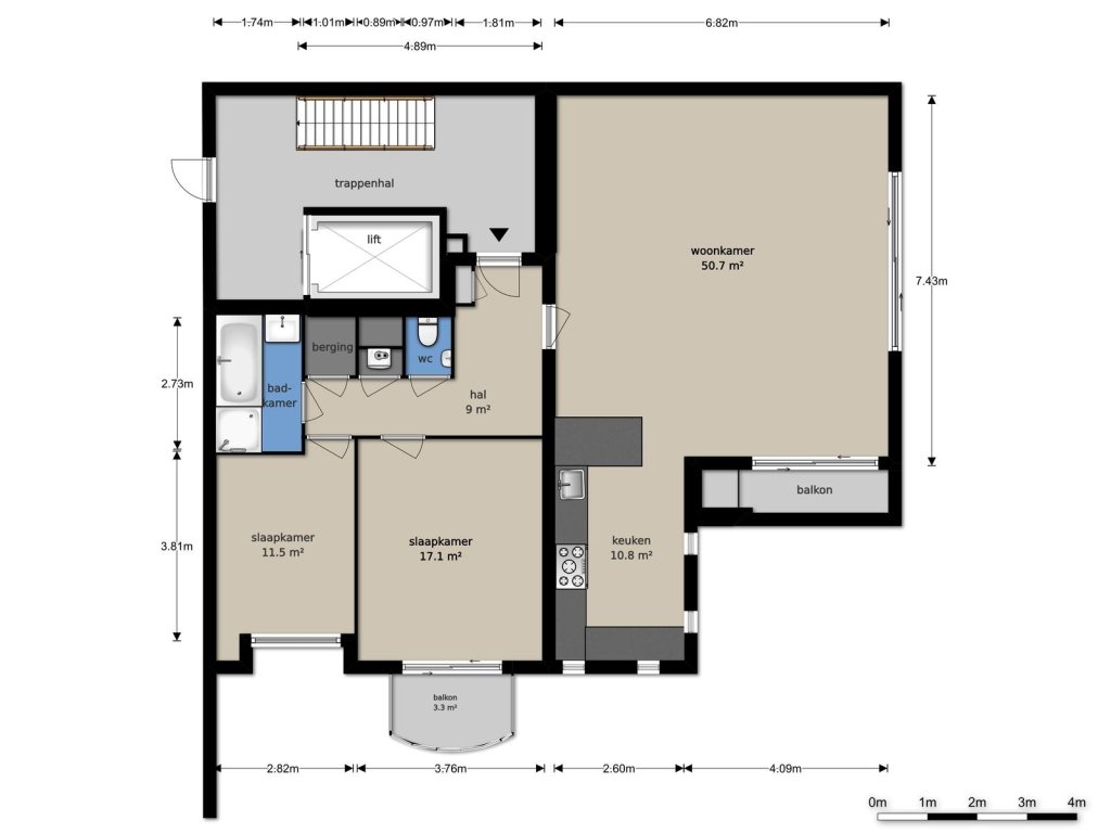 Hier bevinden zich ook twee ruime slaapkamers (ca. 17 en 11,5 m²). De grootste kamer geeft toegang tot een tweede balkon aan de straatzijde.