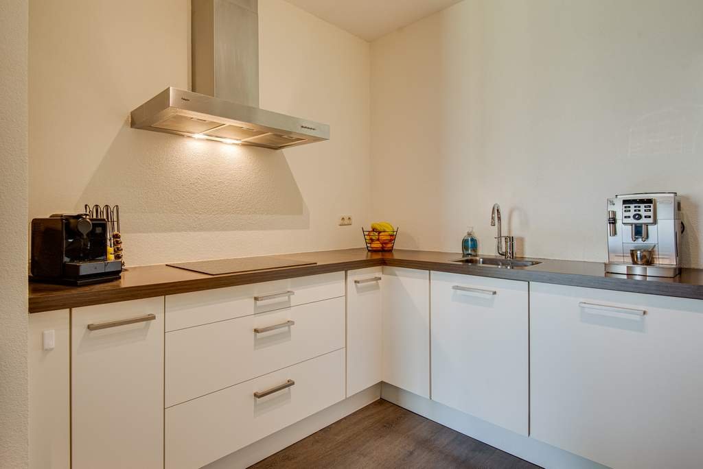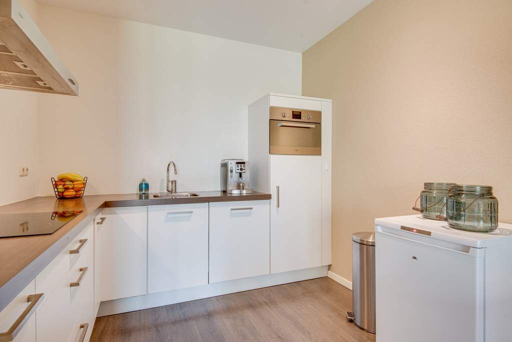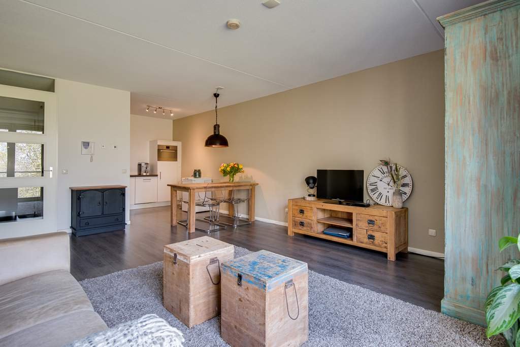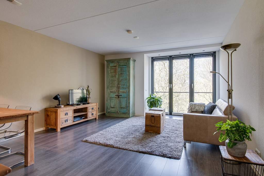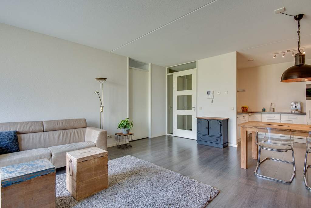 De royale, lichte woonkamer beschikt over openslaande deuren op het Westen. Het balkon is een Frans balkon. De woonkamer heeft een lichte laminaatvloer, waardoor het ruim oogt. De woonkamer beschikt over een apart eetgedeelte. De open keuken is luxe afgewerkt met inbouwapparatuur waaronder een koelkast, afzuigkap, 4-pits keramische kookplaat, geïntegreerde vaatwasser en een combimagnetron.
