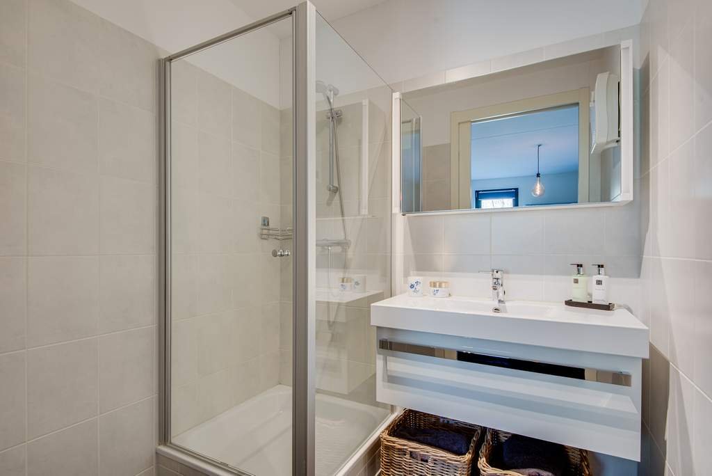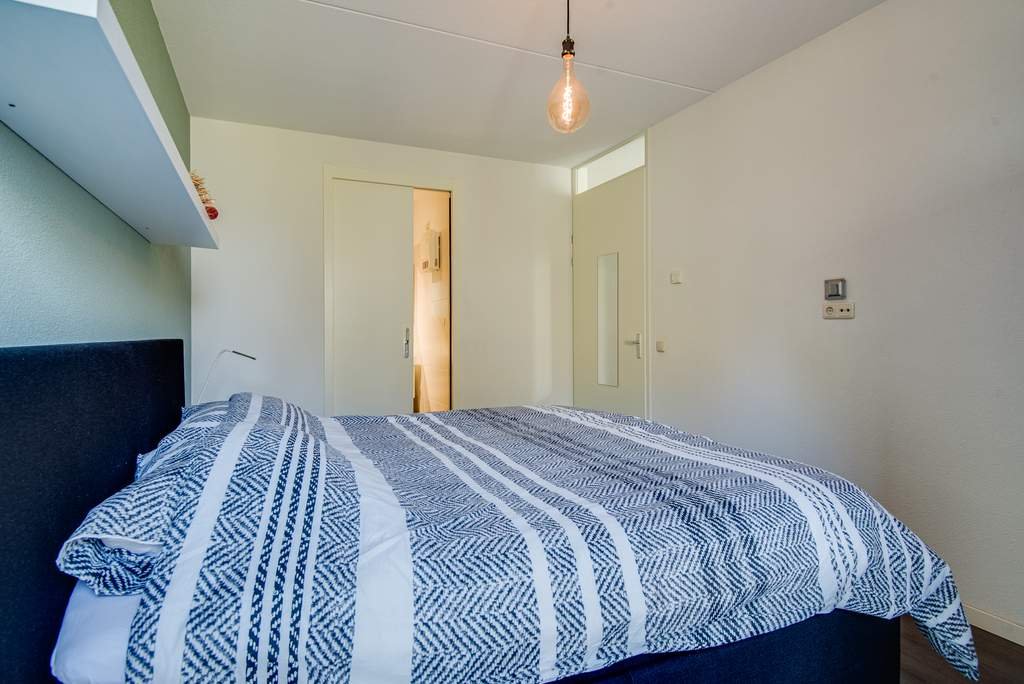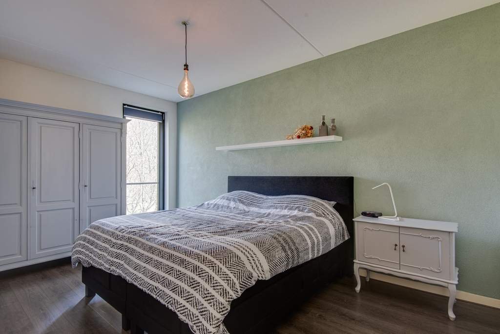 De slaapkamer is ruim van opzet en beschikt eveneens over dezelfde laminaatvloer als de woonkamer. De badkamer grenst aan de slaapkamer, waardoor je als het ware een ensuite creëert. De badkamer is voorzien van een moderne wastafel en douchecabine. De donkere tegelvloer maakt deze badkamer af.