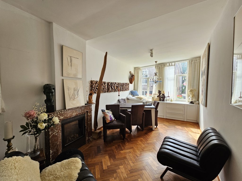 Middels een gang met een trapopgang door naar de eerste etage waar u de woonkamer vindt met een karaktervolle teakhouten vloer en een onbetaalbaar zicht in een van de mooiste steegjes van de binnenstad.