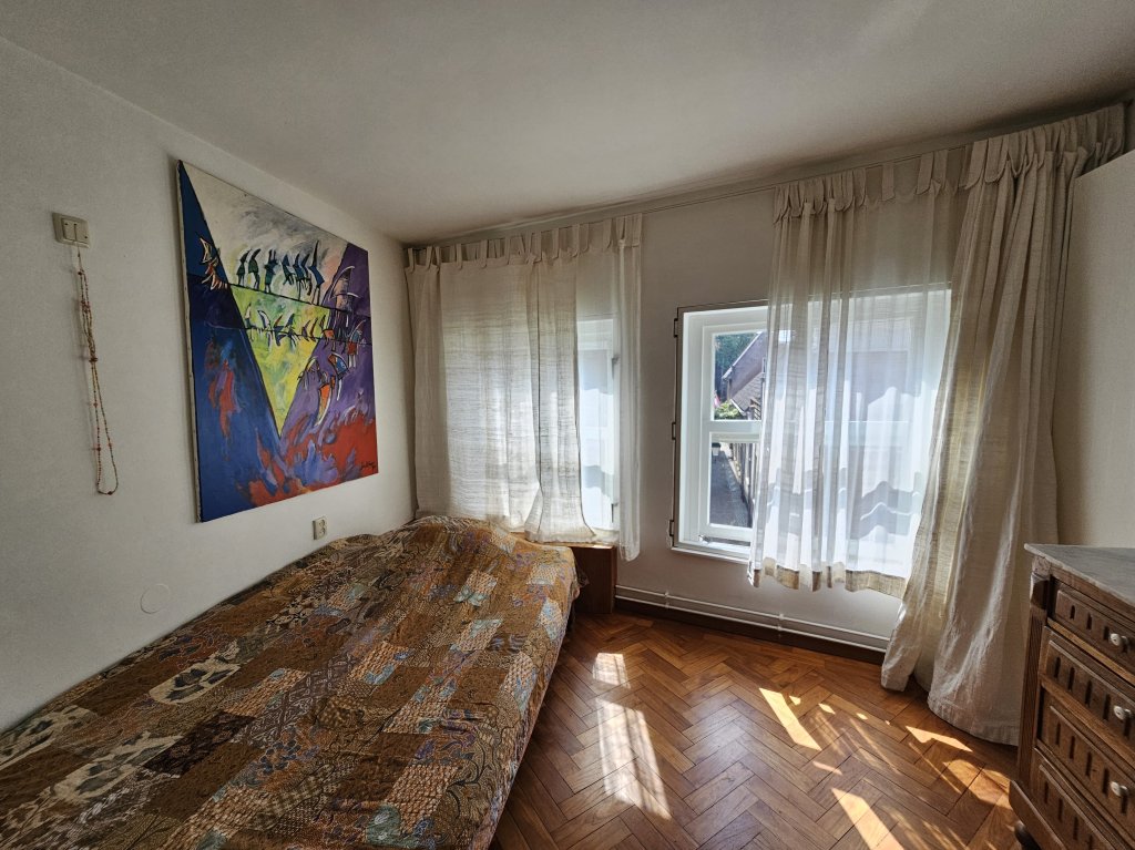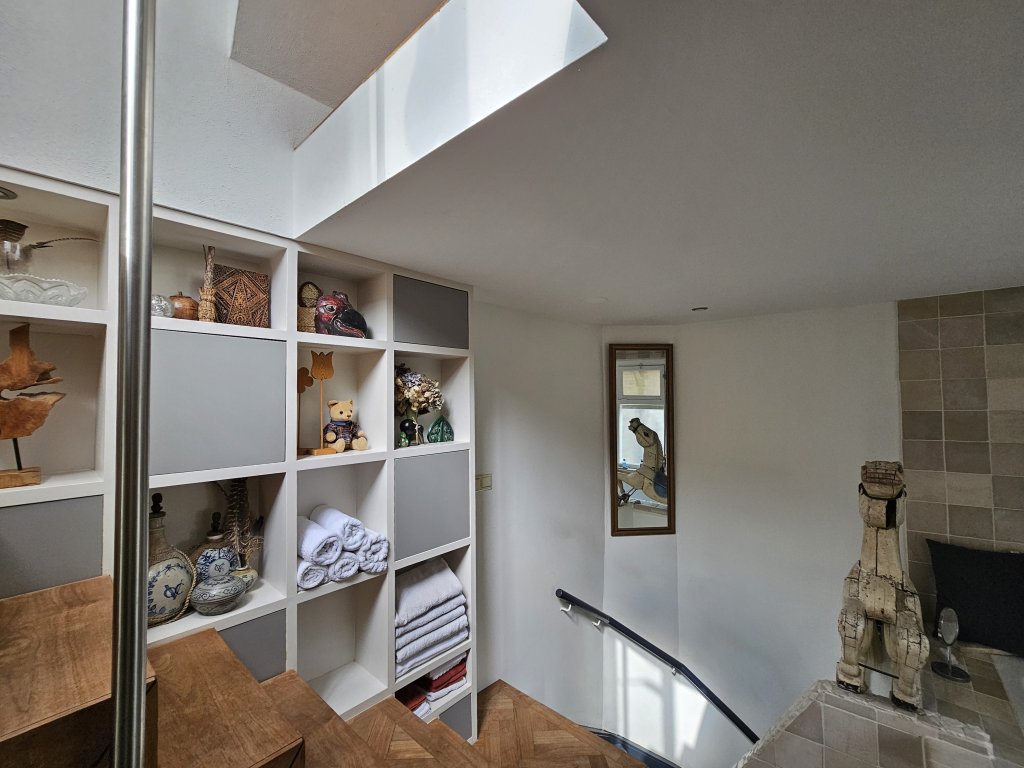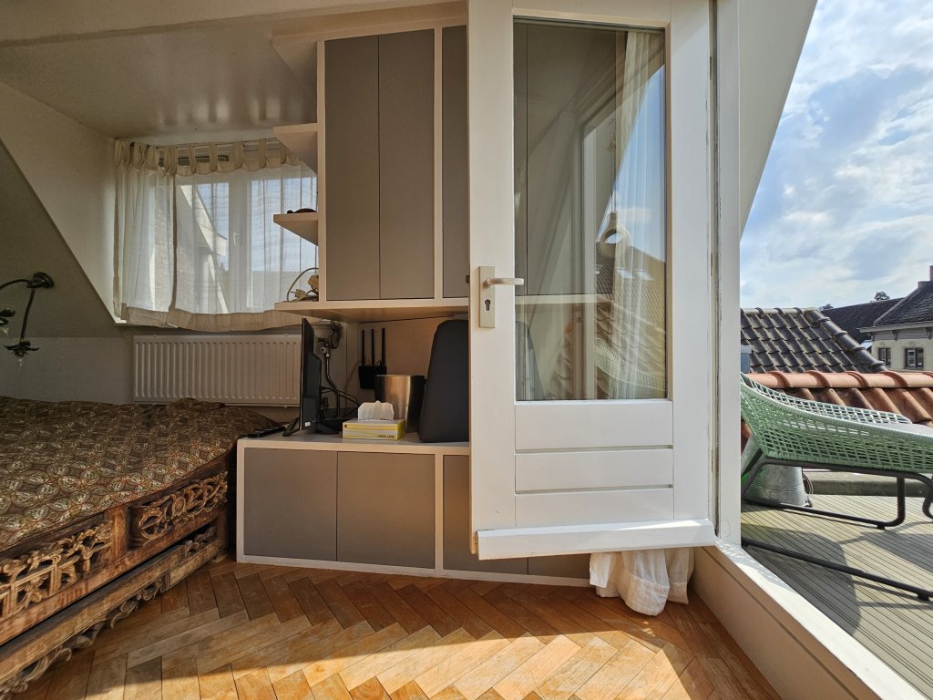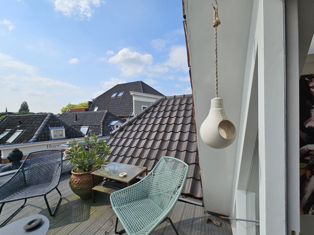 Op de bovenste etage een sfeervolle slaapkamer onder het dak, deze geeft toegang tot het eigen dakterras van ~12 m2, hier heeft u een fantastisch uitzicht over de historische daken en een hele fijne plek om aan de drukte te ontsnappen.