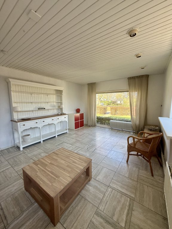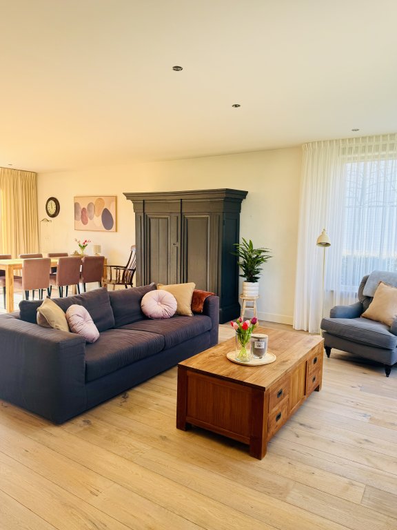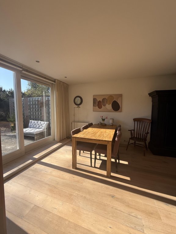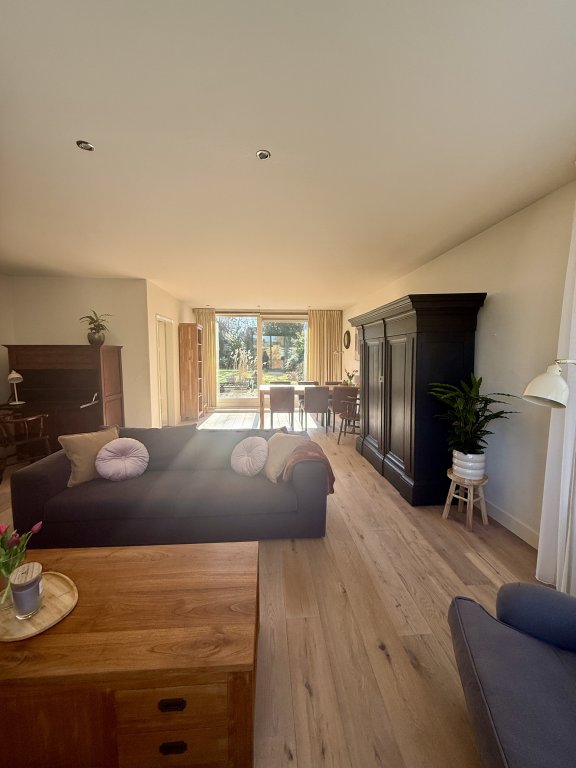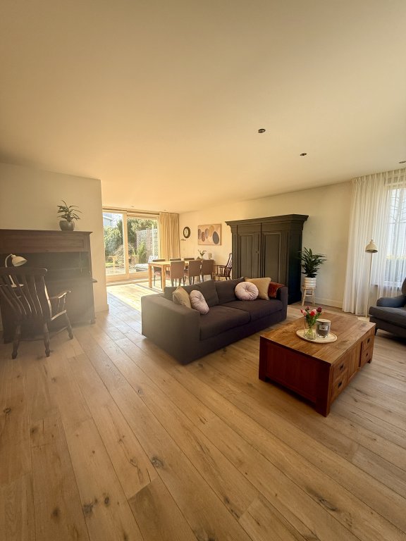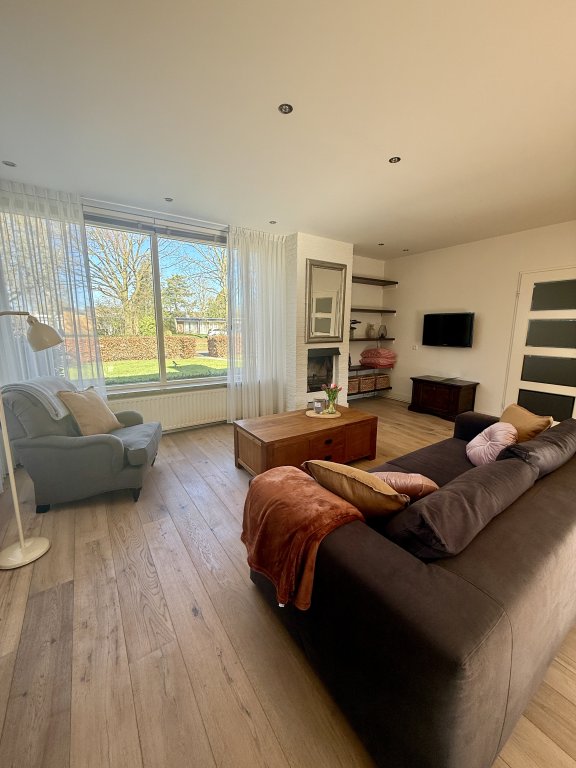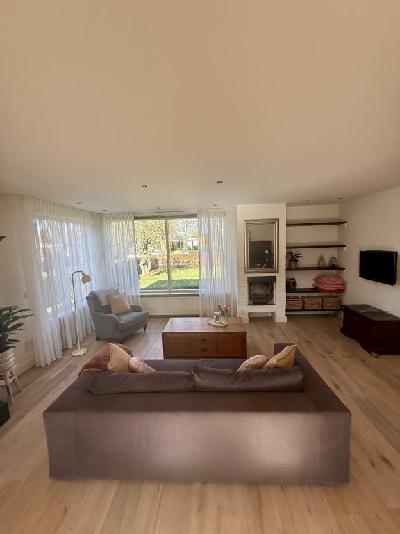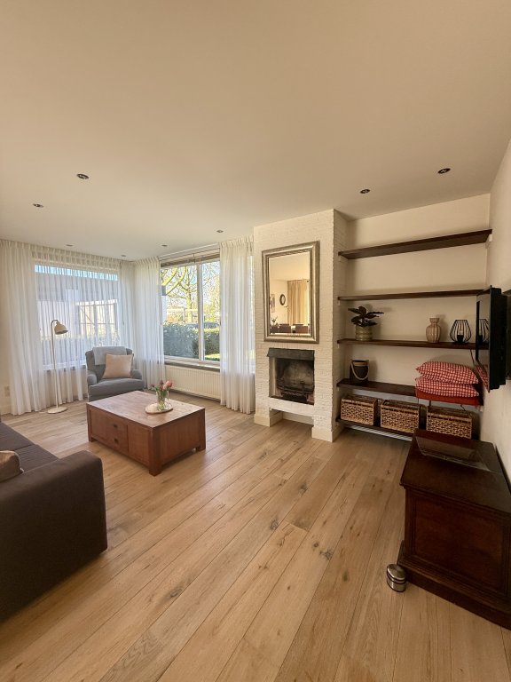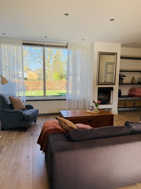 Woonkamer: Ruime, lichte woonkamer met (gas) open haard en openslaande deuren naar de tuin.