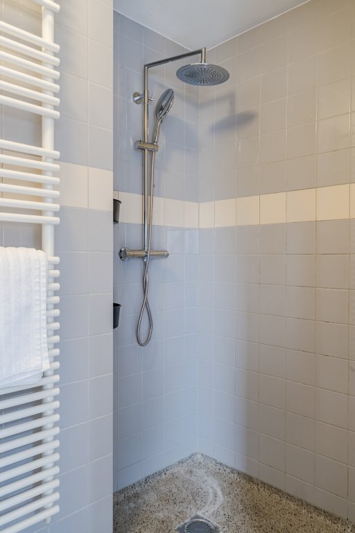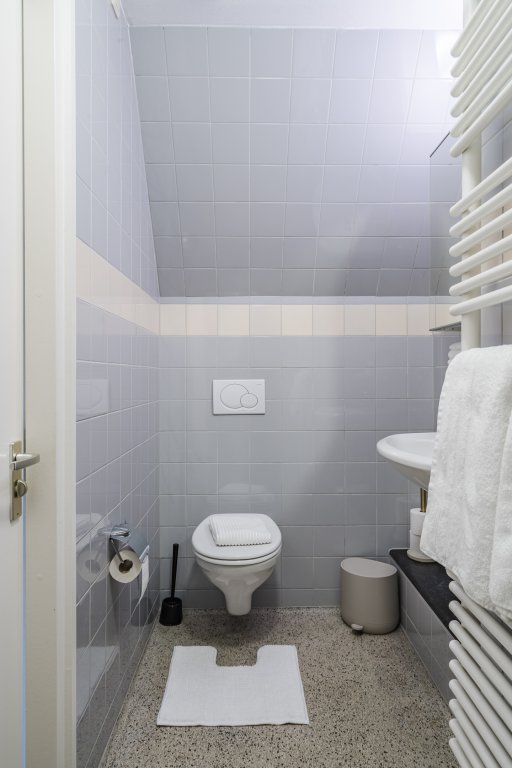 De badkamer is modern uitgevoerd en voorzien van een douche, wastafel en tweede toilet. Daarnaast is er een separaat toilet aanwezig.