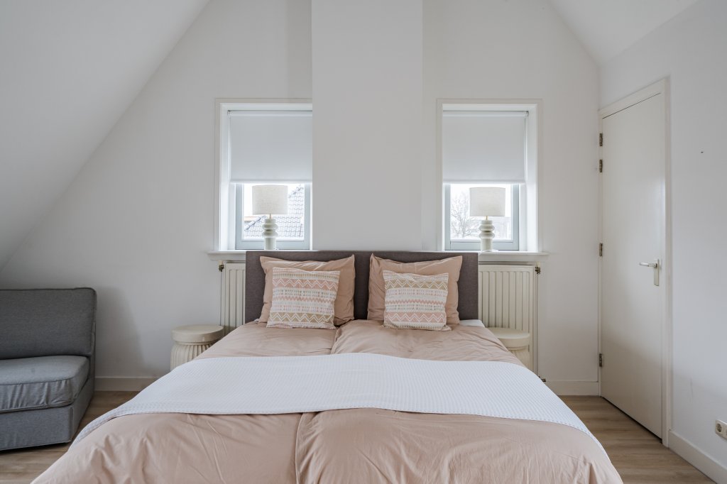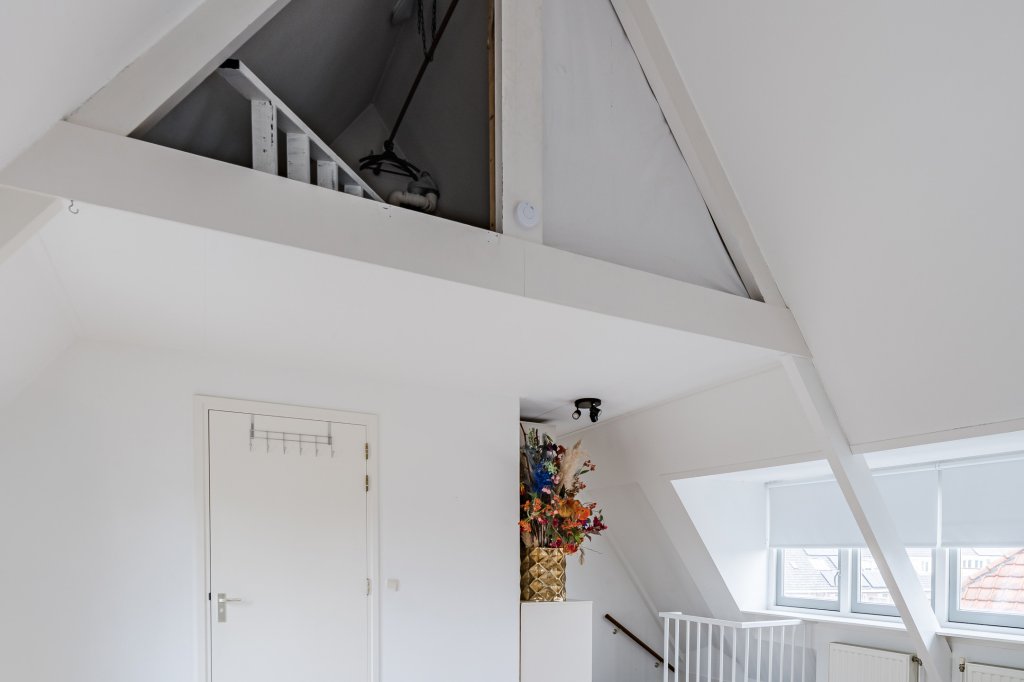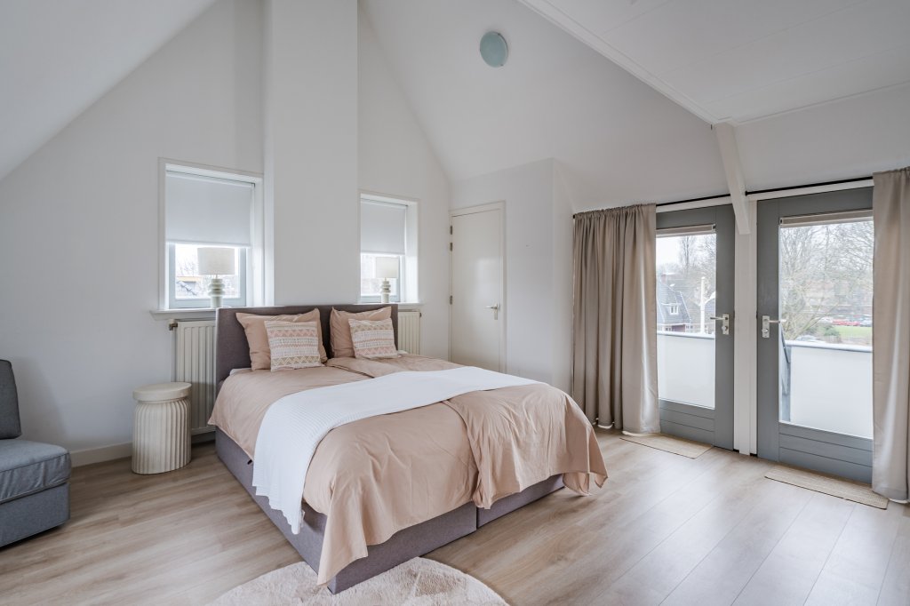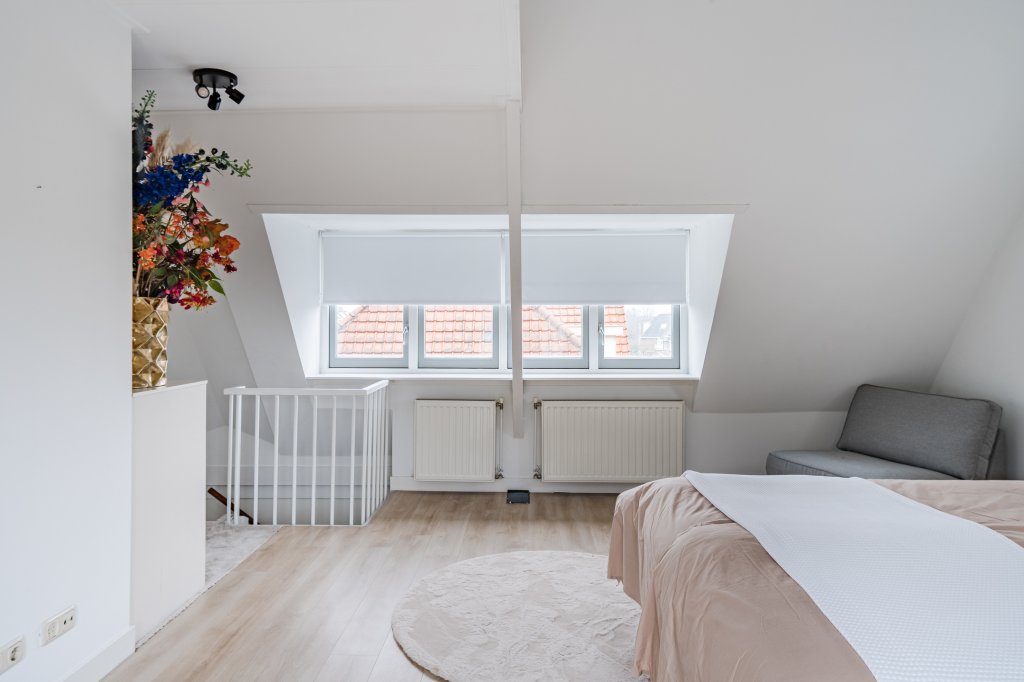 Op de verdieping bevindt zich een grote, loftachtige slaapkamer met extra opbergzolder, ideaal voor wie ruimte en flexibiliteit zoekt. Hier tref je ook een loggia/balkon met vrij uitzicht over het park, wat zorgt voor een heerlijk gevoel van ruimte en groen.