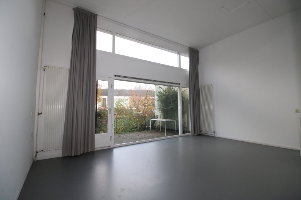 De woonkamer geeft doorgang naar de gelevelde tuin met achterom.