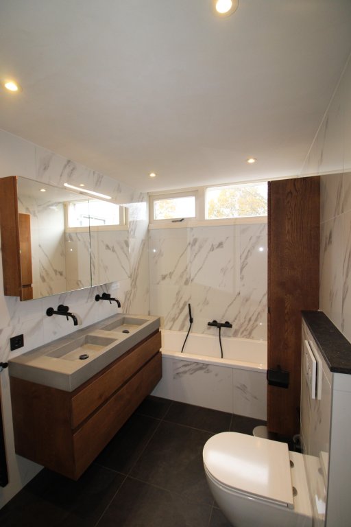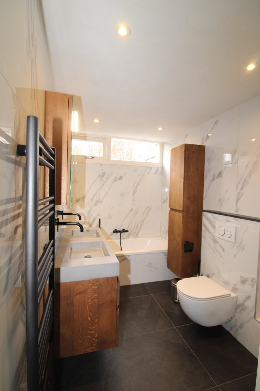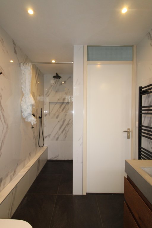 Op deze verdieping vindt u rechts een ruime slaapkamer, bankje en kledingkast. In de hal bevindt zich nog een opbergruimte. Vervolgens aan de linkerzijde een ruime slaapkamer met eigen balkon aan de voorzijde van de woning. En niet te vergeten een tweede badkamer, voorzien van 2 wastafels, bad, vrijhangend toilet, aparte douche.
