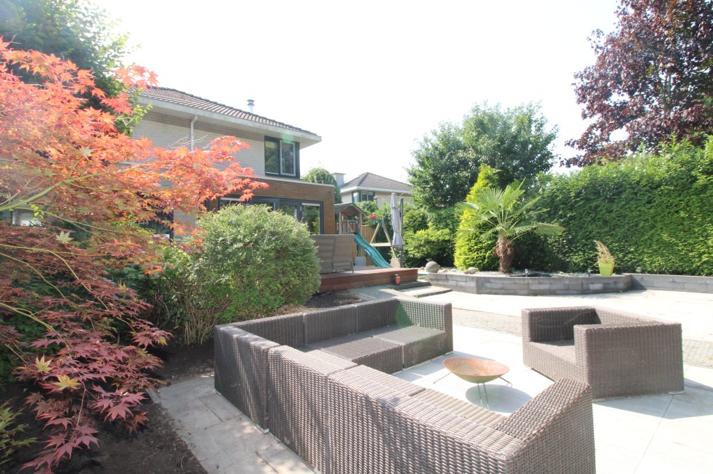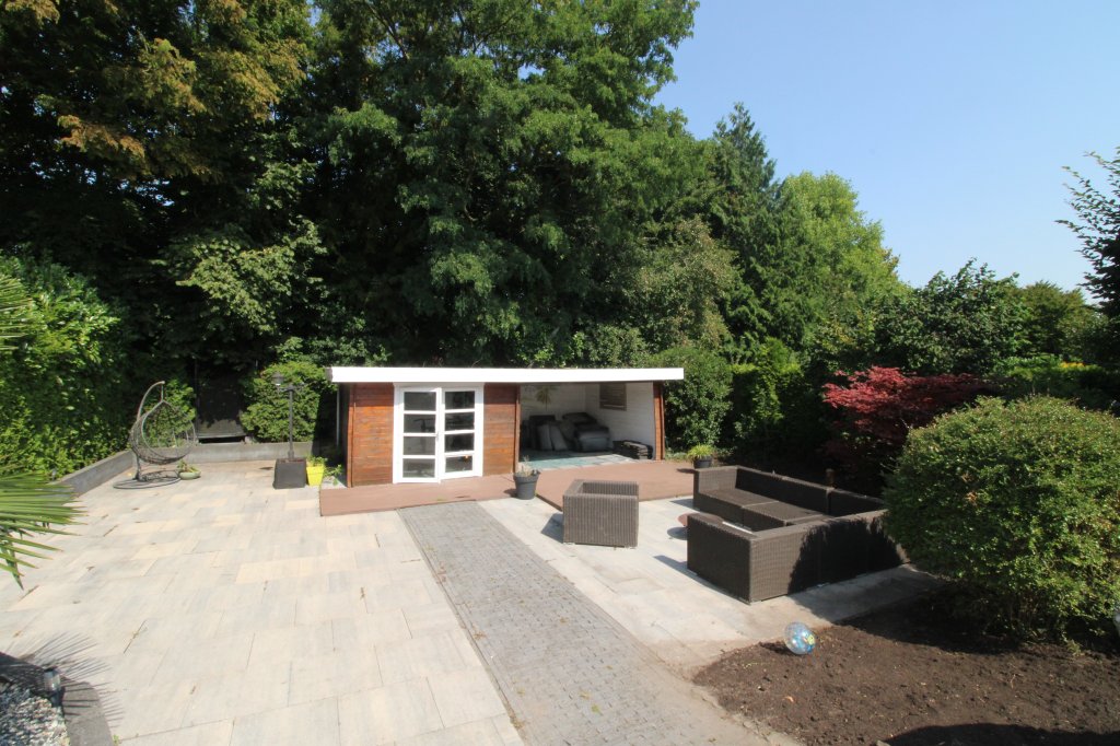 Tuin: Mooie, ruime, diepe achtertuin met veel privacy en diverse terrassen. In de achtertuin staat een houten berging met een overkapping/loungeruimte.