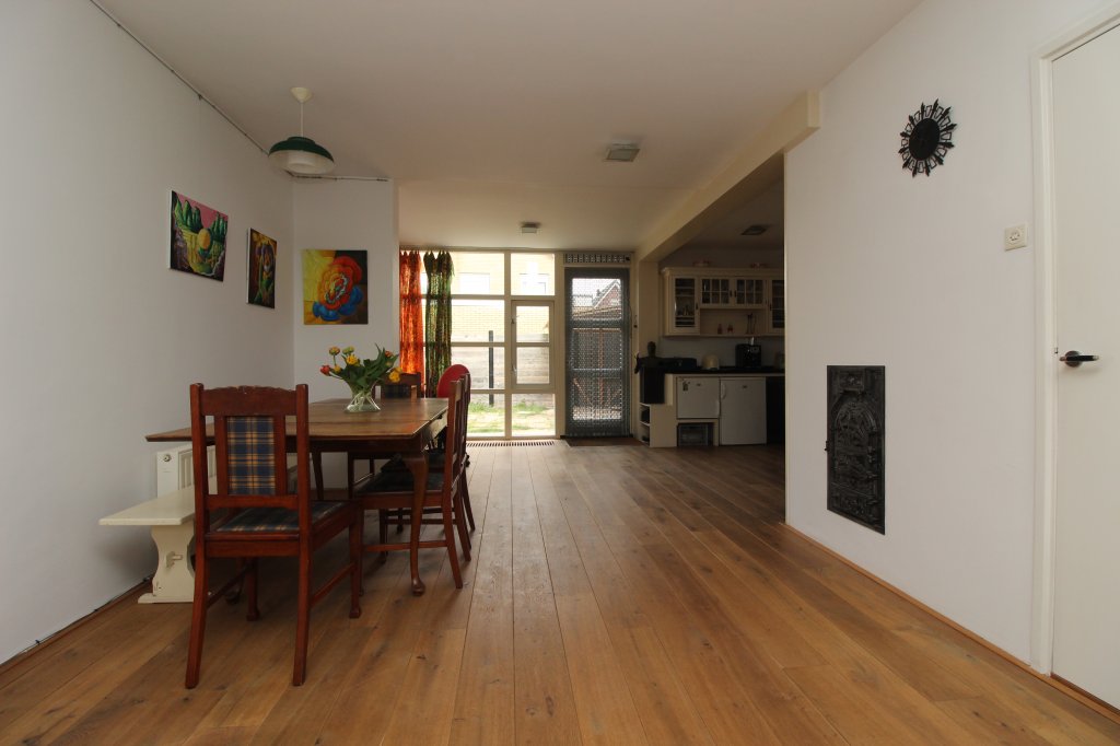 Entree, hal met meterkast, garderobe, trapopgang naar de eerste verdieping, toilet met fontein en toegang tot de ruime woonkamer met deur naar de achtertuin en half open keuken voorzien van diverse inbouwapparatuur.