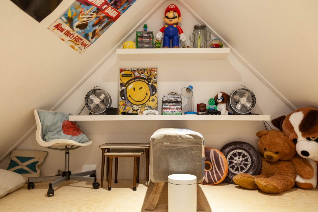 De overloop op de tweede verdieping geeft toegang tot twee ruime slaapkamers. Op de zolderverdieping bevindt zich ook nog een ruimte waar de CV is geplaatst en de aansluitingen van de zonnepanelen zijn aangebracht. Ook zitten hier de aansluitingen voor de wasmachine en de droger. Als extraatje is op de zolderverdieping de vliering omgebouwd tot een extra ruimte die via een vaste trap te bereiken is; deze ruimte wordt nu gebruikt als ‘gamezolder’!