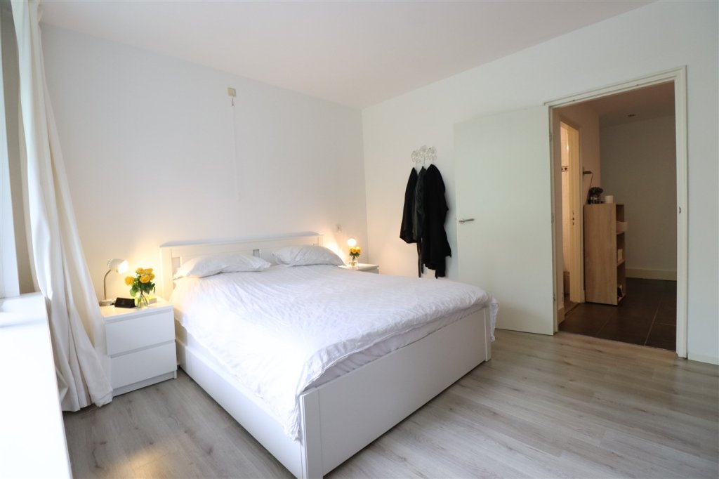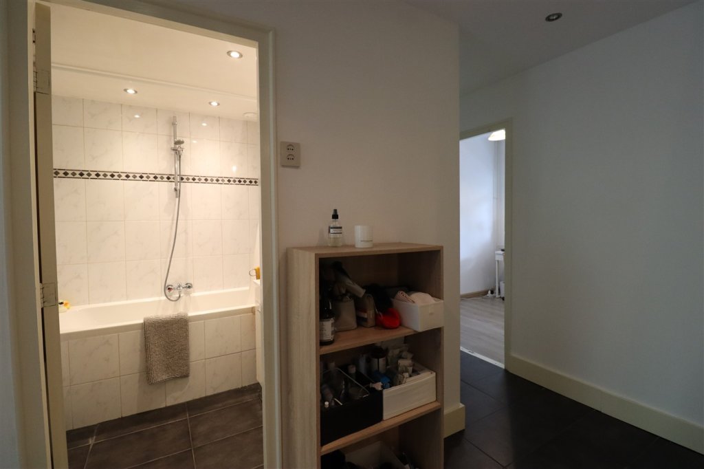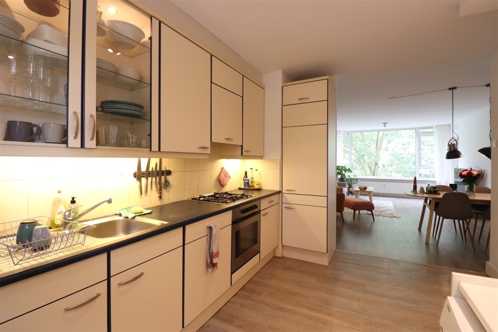 Het voormalige tochtportaal beschikt naast de meterkast tevens over de gaderobe. Het tweede gedeelte van de hal biedt toegang tot de overige vertrekken van het appartement. In een fraaie doorzonopstelling treft u aan de achterzijde woonkamer met de semi open keuken aan de voor-/galerijzijde. De keuken heeft een parallel opstelling en is voorzien van de nodige inbouwapparatuur, zoals koel-/vriescombinatie, 5-pits gaskookplaat, wasemkap, oven, vaatwasser, wasmachine en droger. De master bedroom bevindt zich aan aan de achterzijde en het balkon is zowel vanuit de woonkamer als ook vanuit deze slaapkamer toegankelijk. De tweede slaapkamer, die momenteel dienst doet als thuiskantoor en logeerkamer bevindt zich aan de voorzijde/galerijzijde. De badkamer en het separate toilet liggen centraal in de woning. De badkamer is voorzien van een wastafelmeubel en een ligbad met hand- en regendouche. het separate toilet beschikt over een fonteintje. De gehele woning beschikt over mooie, zeer grote raampartijen.