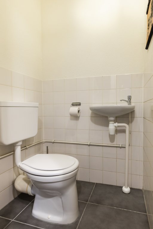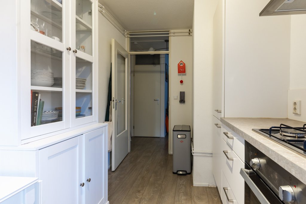 Aan de achterzijde ligt ook de keuken, deze beschikt over diverse inbouwapparatuur. De wasmachine bevindt zich in een seperate kast in de gang, tevens is het toilet ook seperaat.