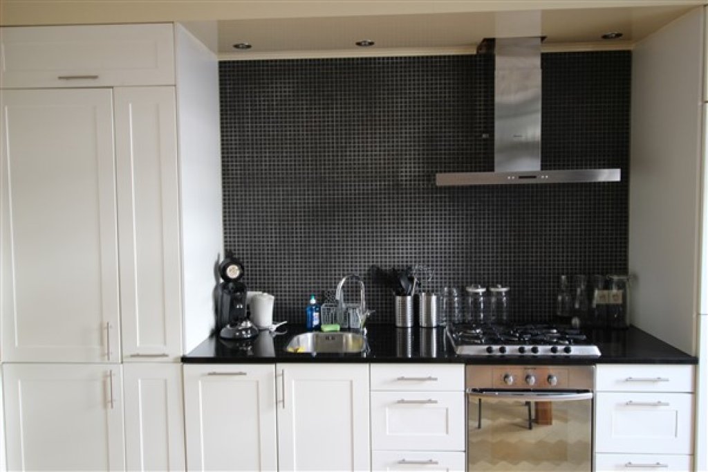 De ruime open keuken is uitgerust met alle benodigde moderne apparatuur en heeft een mooie houten eettafel. Zowel vanuit de keuken als vanuit de slaapkamer is er directe toegang tot het balkon aan de achterzijde van de woning, met uitzicht op de binnentuin. In de hal bevindt zich een separaat toilet.
