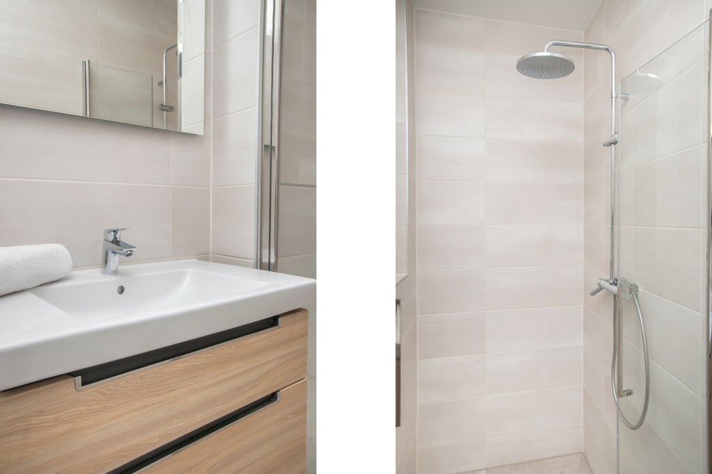 De slaapkamer is geschikt voor een tweepersoonsbed. De badkamer is voorzien van een zeer comfortabele inloopdouche, wastafelmeubel met badkamerspiegel, mechanische ventilatie en vloerverwarming. Het geheel is uitgevoerd in neutrale kleuren.