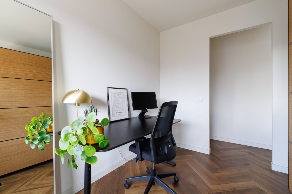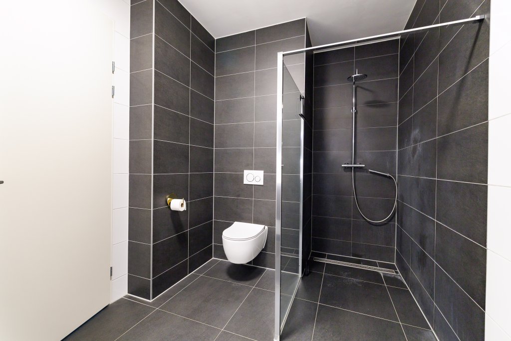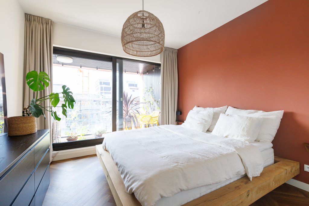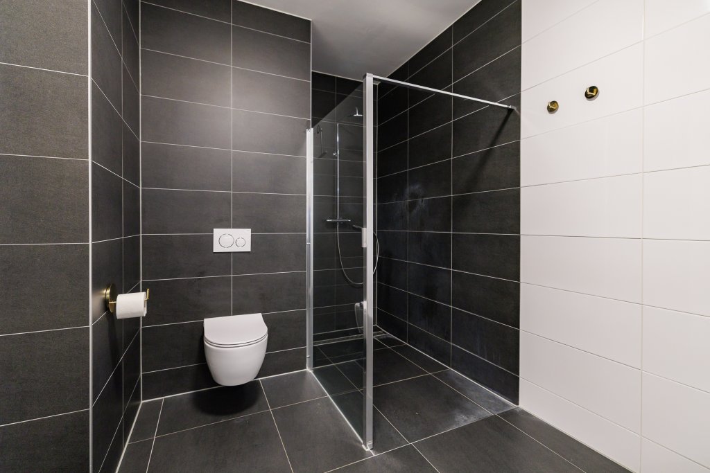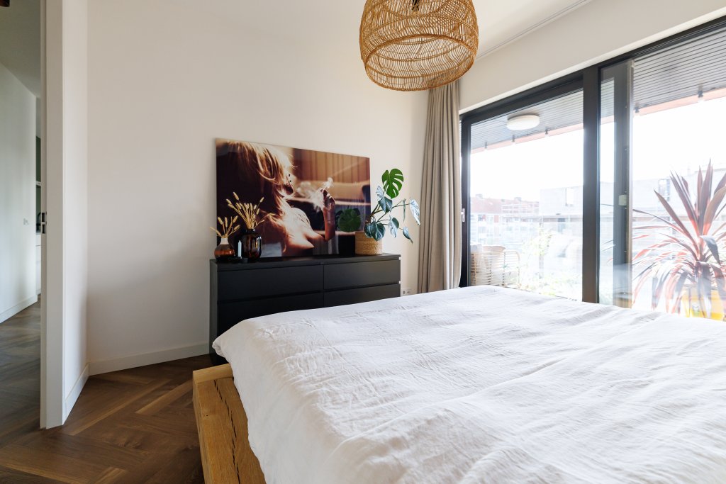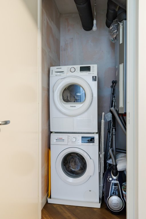 De woning beschikt over een ruime slaapkamer en een lichte werk/kastenkamer. De moderne badkamer is voorzien van een inloopdouche, toilet en wastafelmeubel. Daarnaast is er een interne berging met aansluiting voor wasmachine en droger, wat bijdraagt aan het praktische karakter van deze woning.