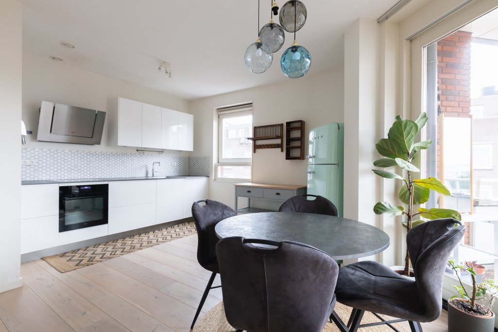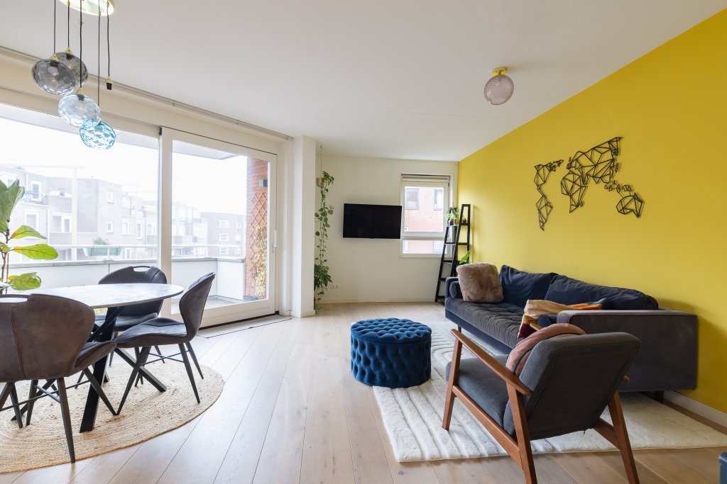 De ruime en kleurrijke woonkamer met open keuken biedt dankzij de grote ramen veel daglicht en een aangename sfeer. Een fijne ruimte om te ontspannen of gasten te ontvangen. De open keuken sluit perfect aan en is uitgerust met moderne inbouwapparatuur. Koken wordt hier een plezier, mede door de praktische indeling en de directe toegang tot het balkon: een heerlijke plek voor een kop koffie in de ochtend of een moment van rust aan het einde van de dag.
