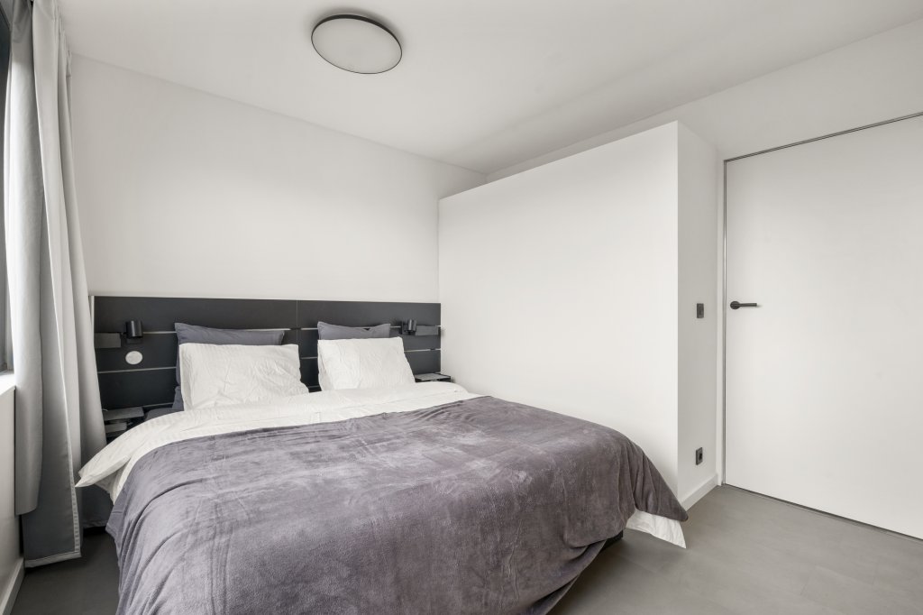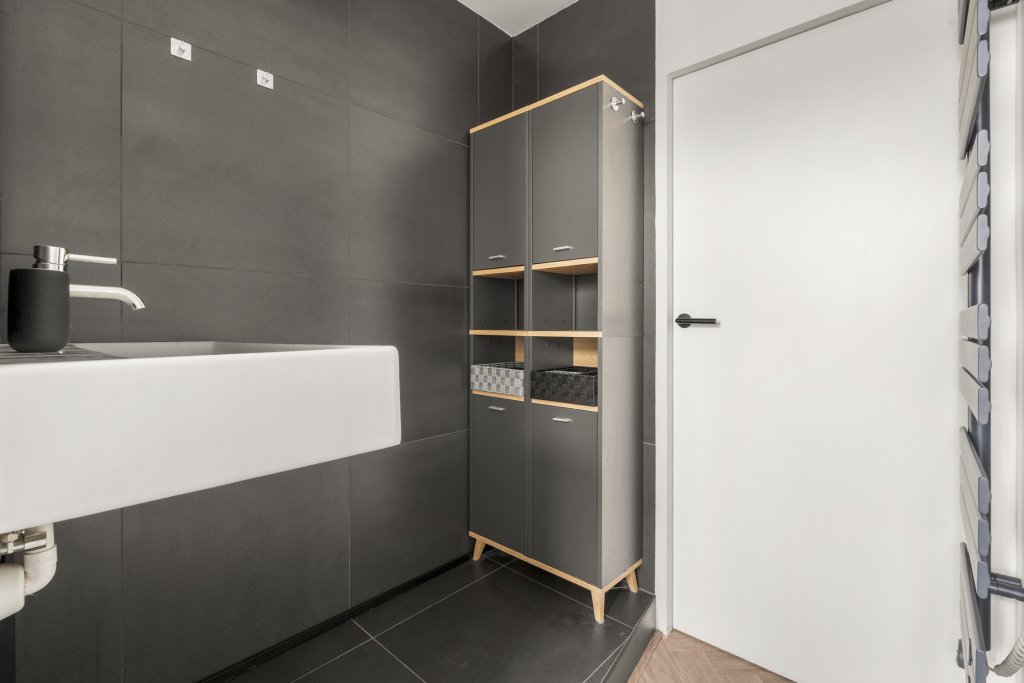 De lichte woonkamer geeft direct toegang tot het ruime dakterras, ideaal om te ontspannen. Vanuit de hal zijn het separate toilet, de moderne badkamer en twee comfortabele slaapkamers bereikbaar.