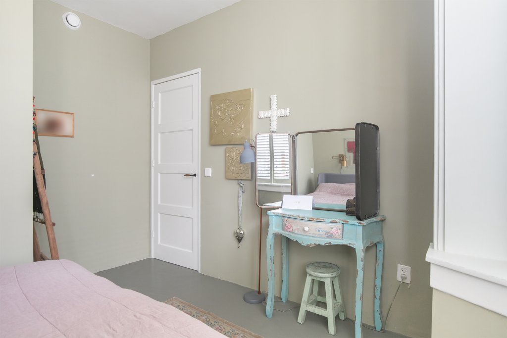 Aan de voorzijde van de woning bevindt zich de royale master bedroom met karakteristieke glas-in-loodramen, die zorgen voor een authentieke jaren ’30 sfeer. Aangrenzend is een extra kamer ingericht als walk-in closet, maar deze ruimte is ook uitstekend te gebruiken als werk- of babykamer.