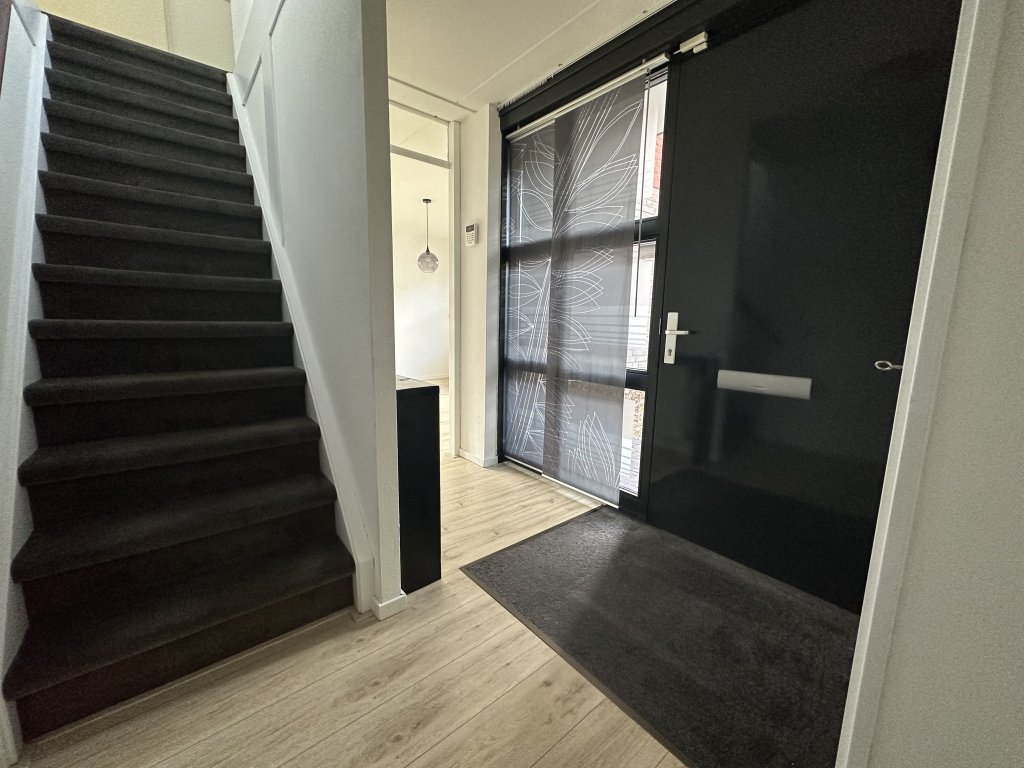 Entree, toilet, trapopgang. Toegang naar royale doorzon woonkamer met veel lichtinval en toegang naar de besloten, onderhoudsvrije patiotuin. Een nette open keuken (geplaatst in 2021) voorzien van een vaatwasser, inductiekookplaat, koelkast, vriezer, combi magnetron-oven en een tafel met hoge stoelen.
