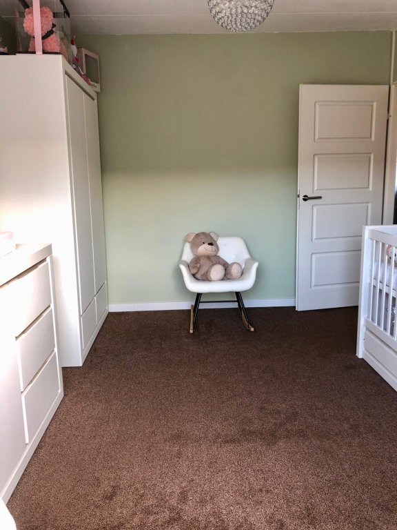 Terug in de hal gaan we via de trap naar de 1e verdieping die is voorzien van een vloerbedekking.