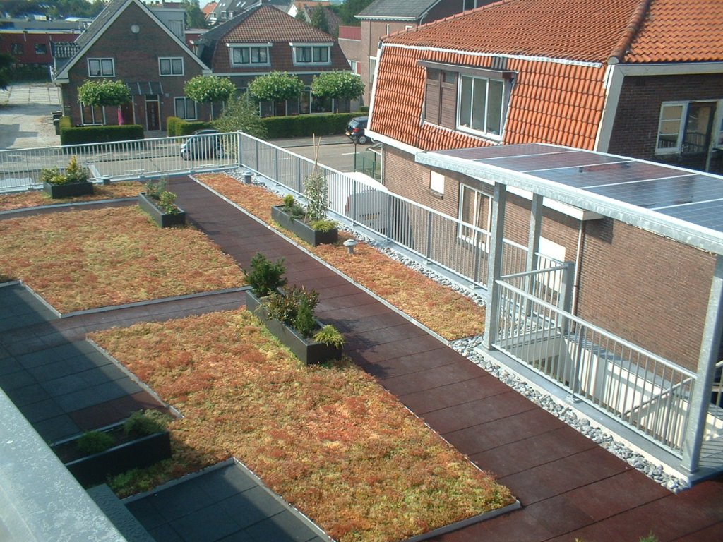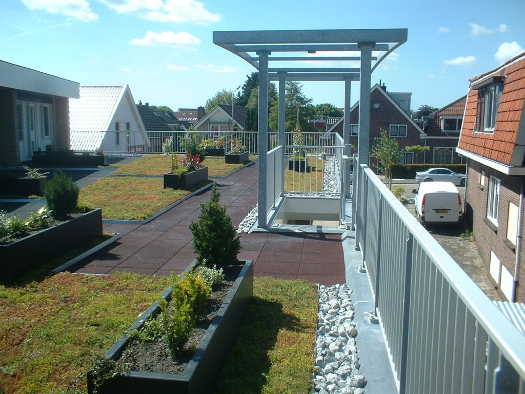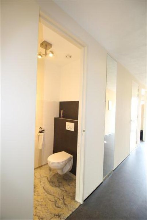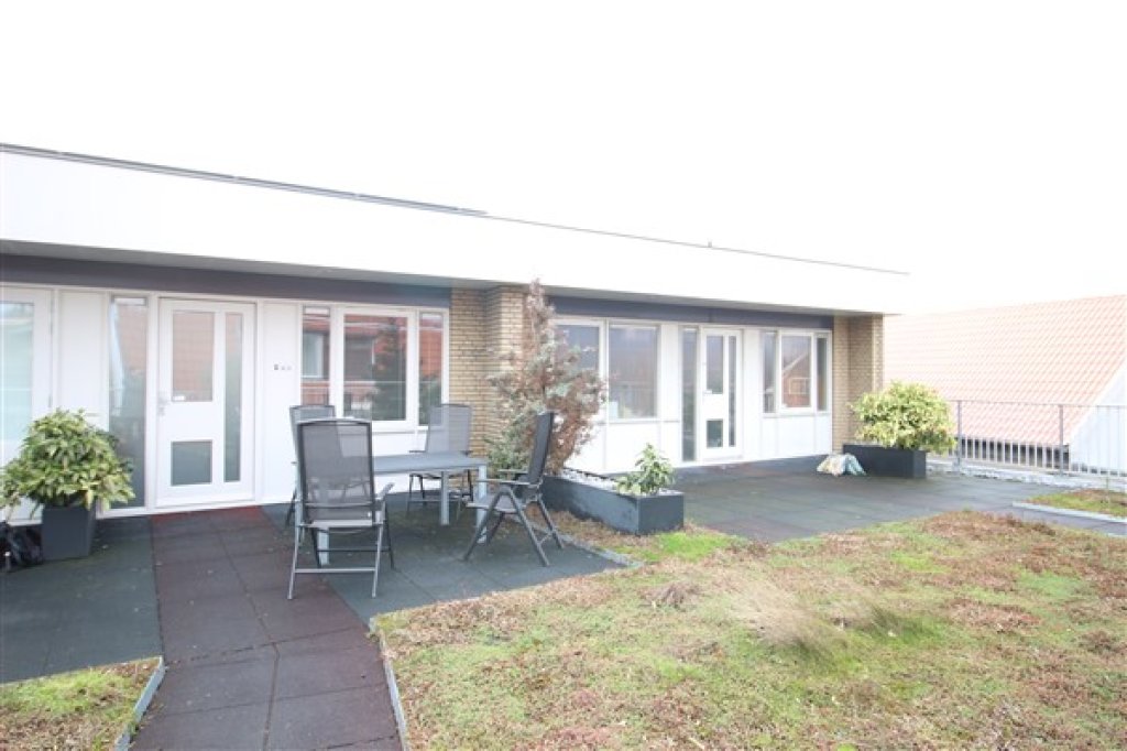 Via de trap bereikt u direct het dakterras van het appartement complex, gelegen op het noordoosten en voorzien van 4 appartementen naast elkaar gelegen. Via de voortuin is er direct toegang tot de langgerekte hal van waaruit alle ruimtes bereikbaar zijn. Aan de voorzijde de eerste ruime slaapkamer en iets verder de tweede ruime slaapkamer is mooi hoog en licht door het sheddak, de derde (was)kamer voorzien van een aanrecht, kastruimte, wasmachine en droger. Iets verder in de hal toegang tot het separate toilet en de badkamer met wastafelmeubel en douche. Aan de achterkant van het appartement bevindt zich de ruime woonkamer met keuken en eethoek. Vanuit de woonkamer is tevens direct toegang tot het balkon op het zuidwesten aan de achterzijde van het appartement.