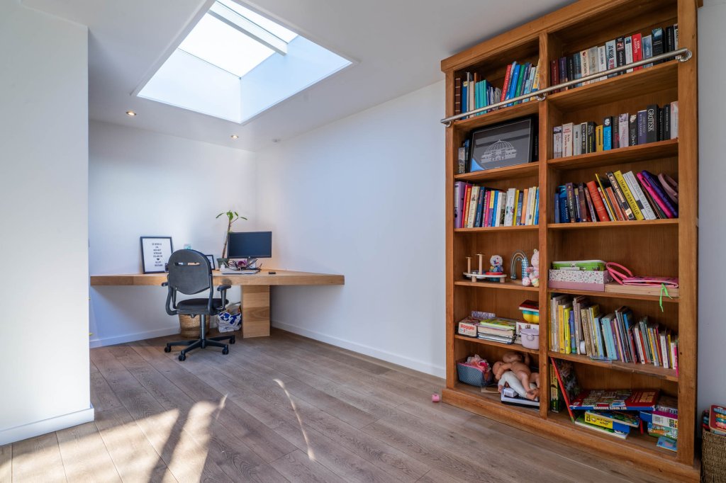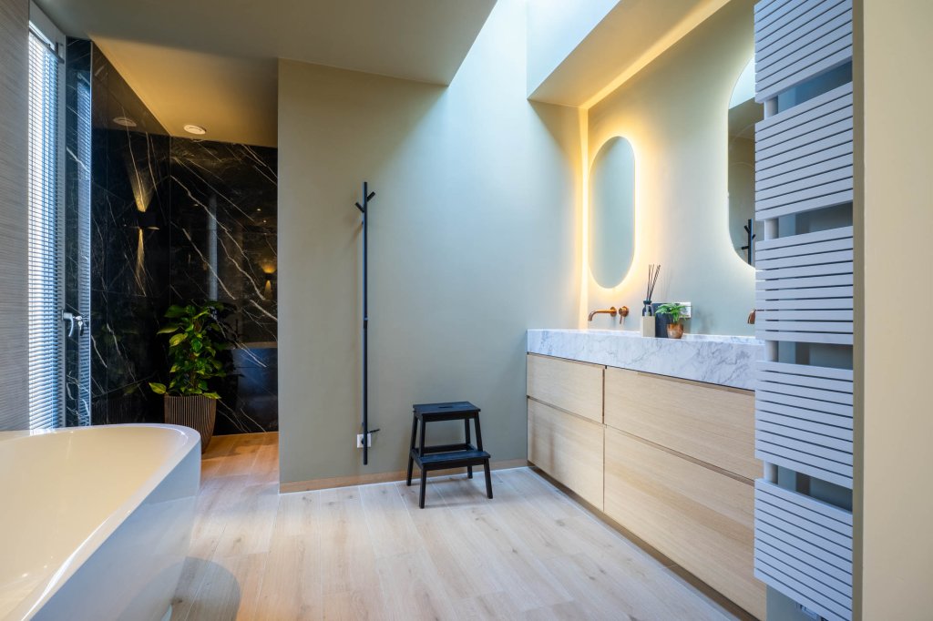 Ruime overloop welke toegang geeft tot alle vier de slaapkamers en de moderne badkamer met zeer mooi ligbad, aparte douche en dubbele wastafel.