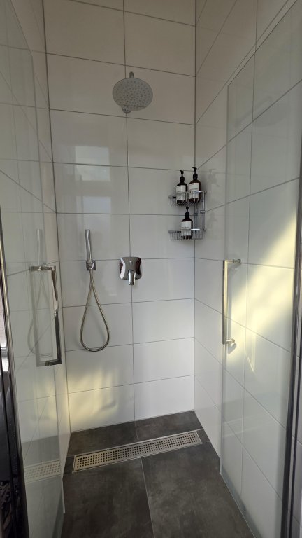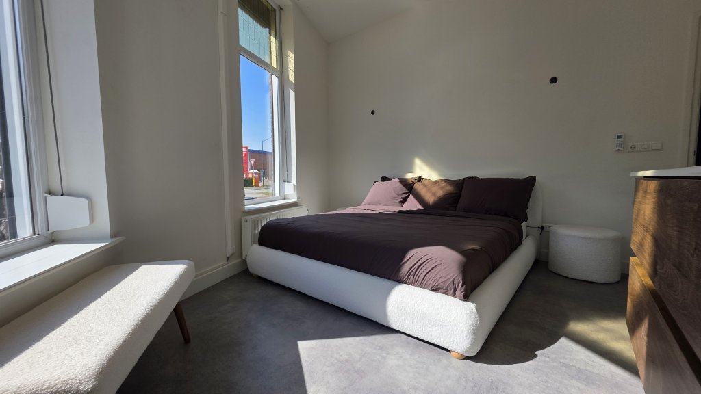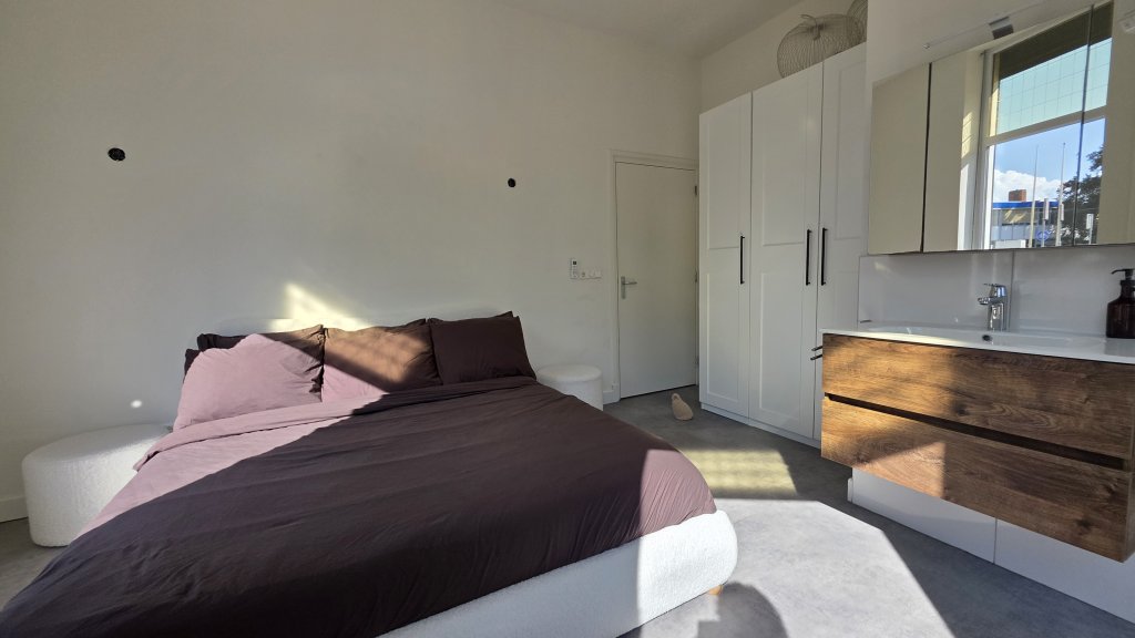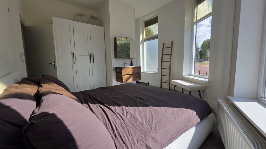 De slaapkamer met wasmeubel ligt is aan de voorzijde van de woning gelegen en biedt toegang tot de douche-ensuite. Tevens beschikt de slaapkamer over een airco.