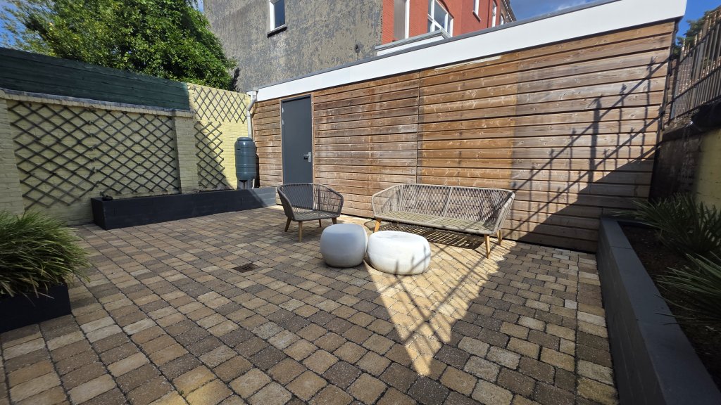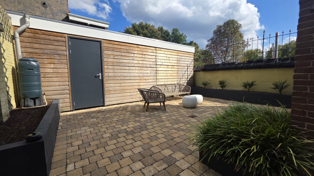 De stadstuin is onderhoudsvriendelijk aangelegd en geeft toegang tot een berging met een achterom.