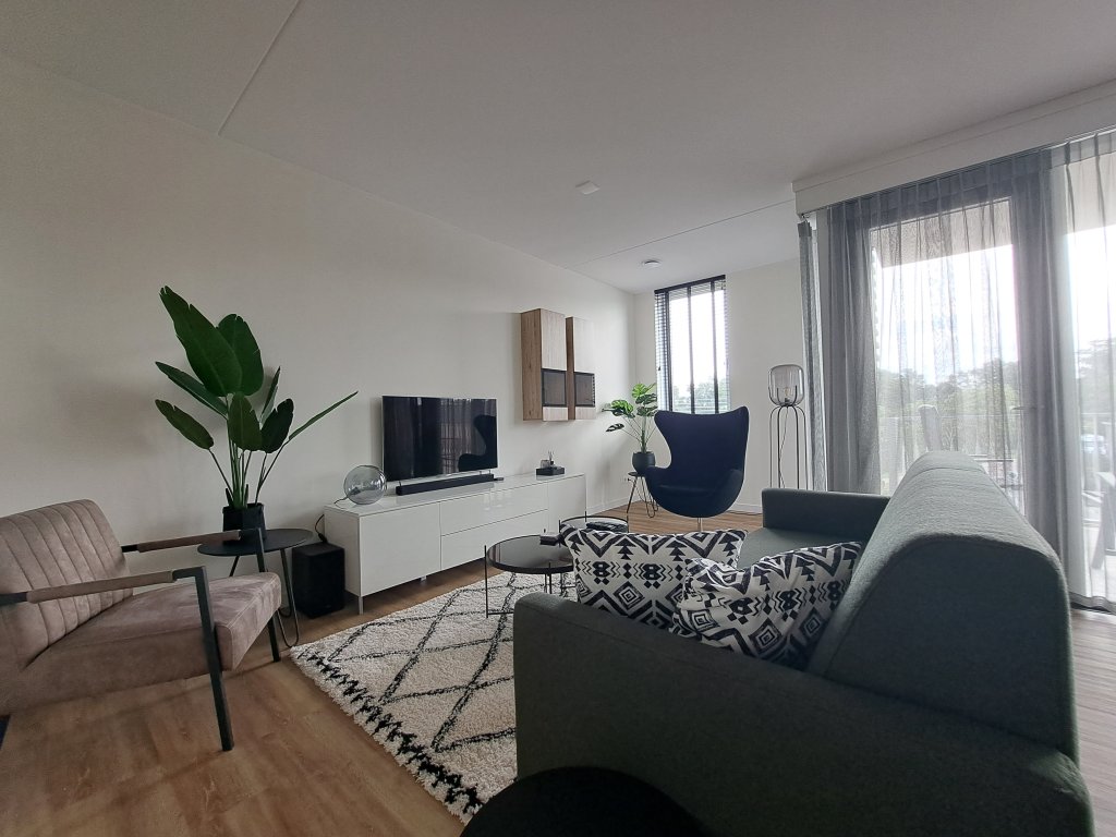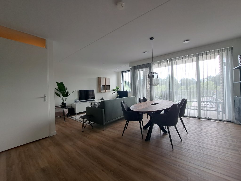De woonkamer met open keuken is gesitueerd aan de lange zijde van het complex. De kamer is voorzien van veel lichtinval en er is een schitterend uitzicht over de omgeving.