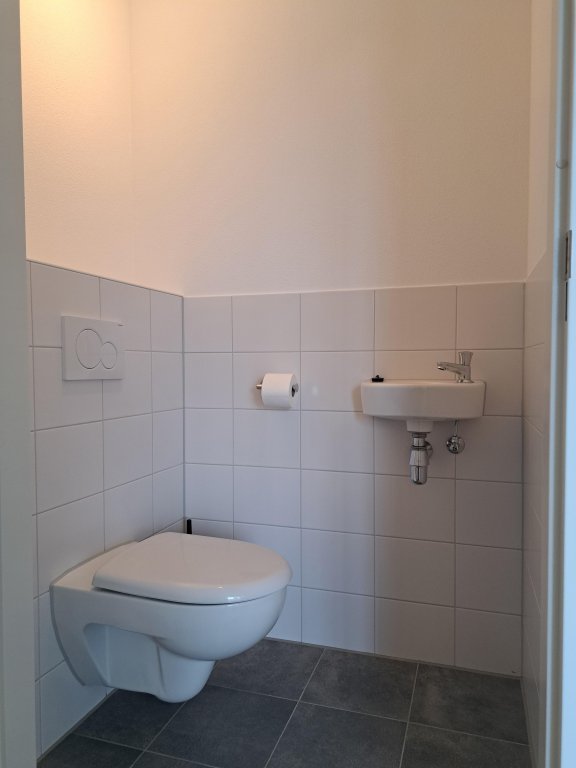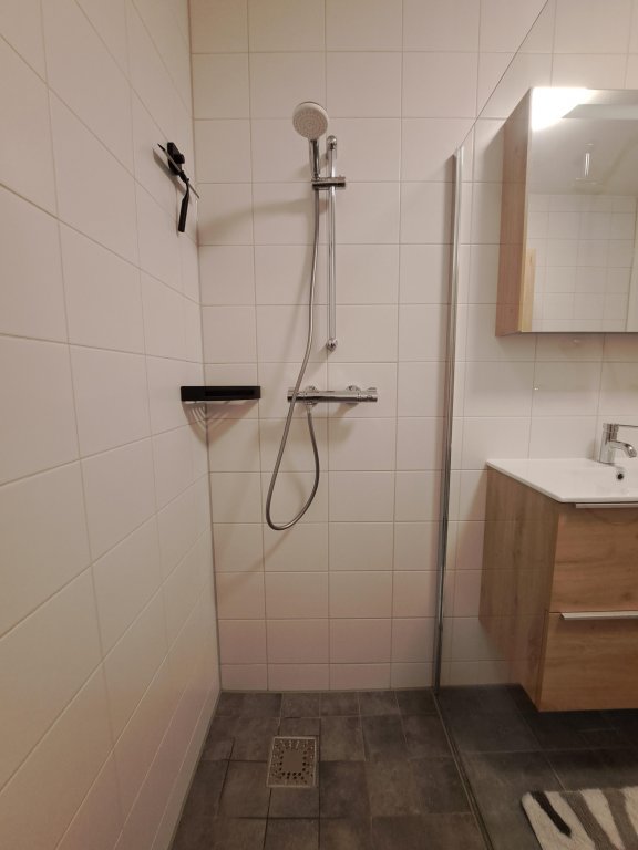 The bathroom (approx. 5 m2) has a walk-in shower, washbasin and a hanging toilet. The bathroom is delivered with tiled floor and walls.