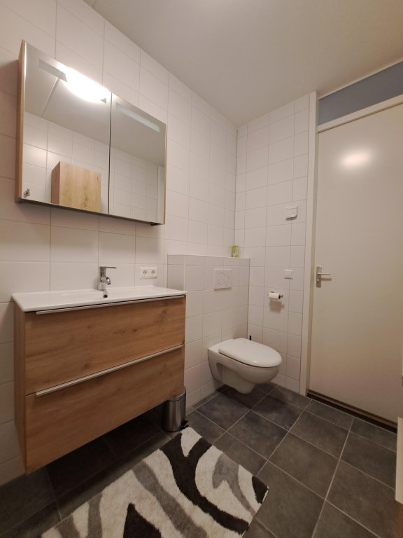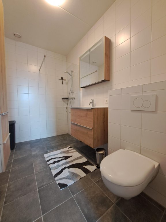 De badkamer (ca. 5 m2) is voorzien van een inloopdouche, wasmeubel en een hangend toilet. De badkamer wordt opgeleverd met betegelde vloer en wanden.