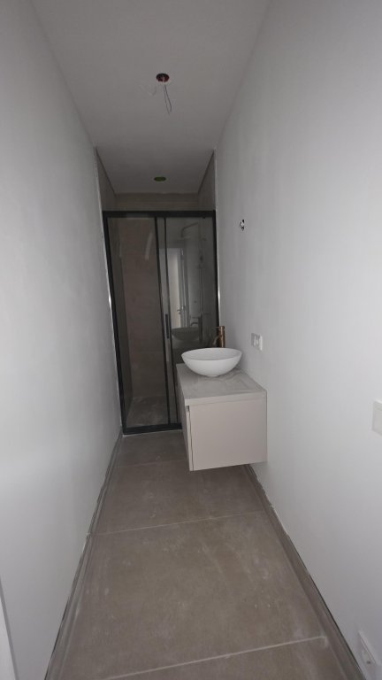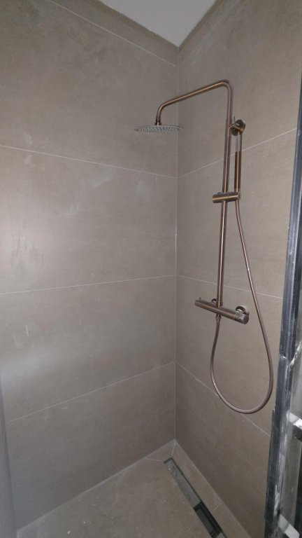 De badkamer is stijlvol afgewerkt en uitgerust met een comfortabele inloopdouche en een modern wasmeubel.