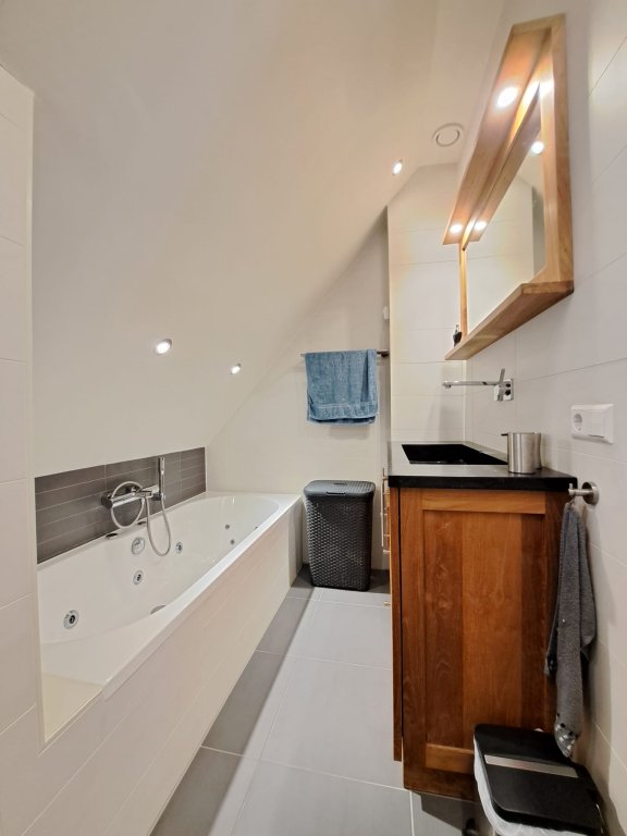 Via de overloop is ook de tweede slaapkamer, voorzien van een 1 persoons bed, en de badkamer bereikbaar. De badkamer heeft zowel een bubbelbad, 2de toilet en een aparte inloop douche. De moderne wastafel met grote spiegel maakt het plaatje helemaal compleet.