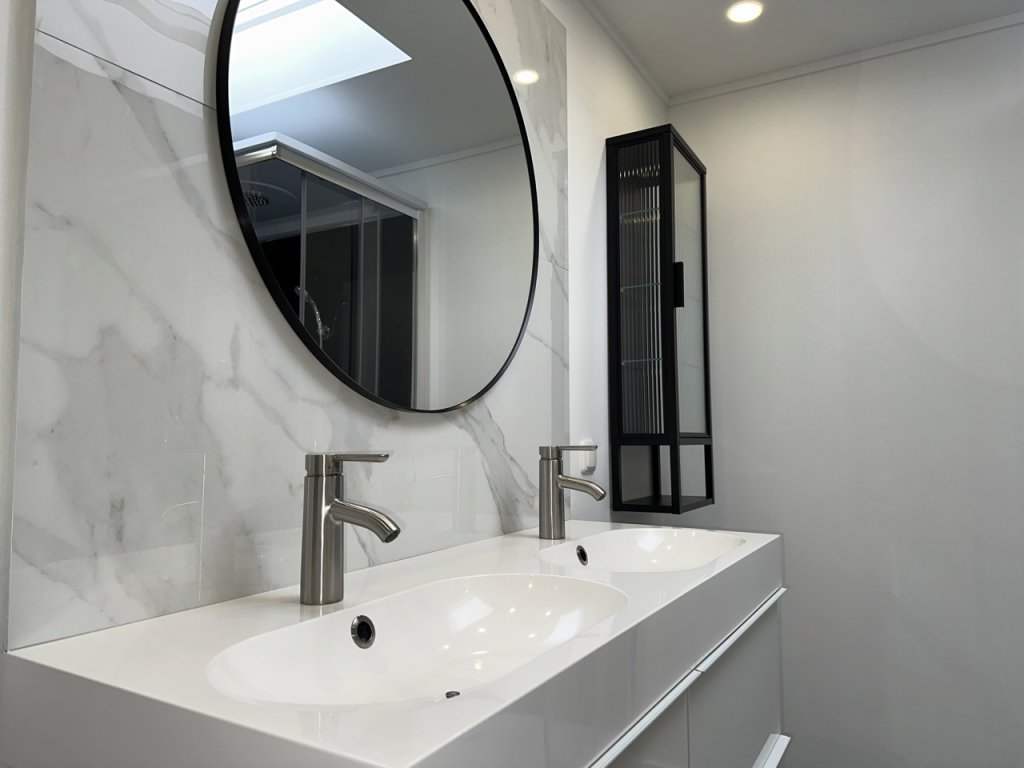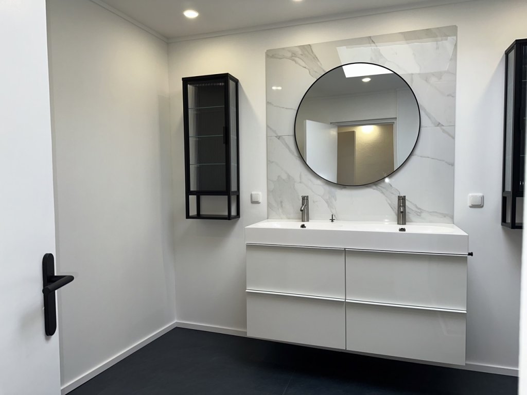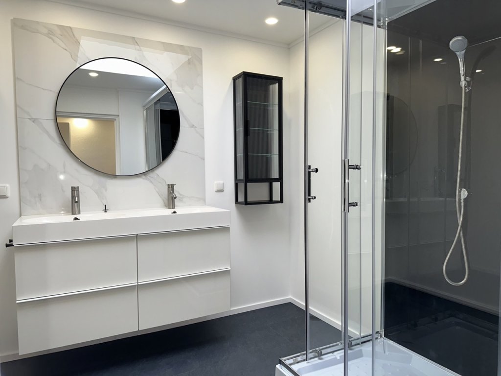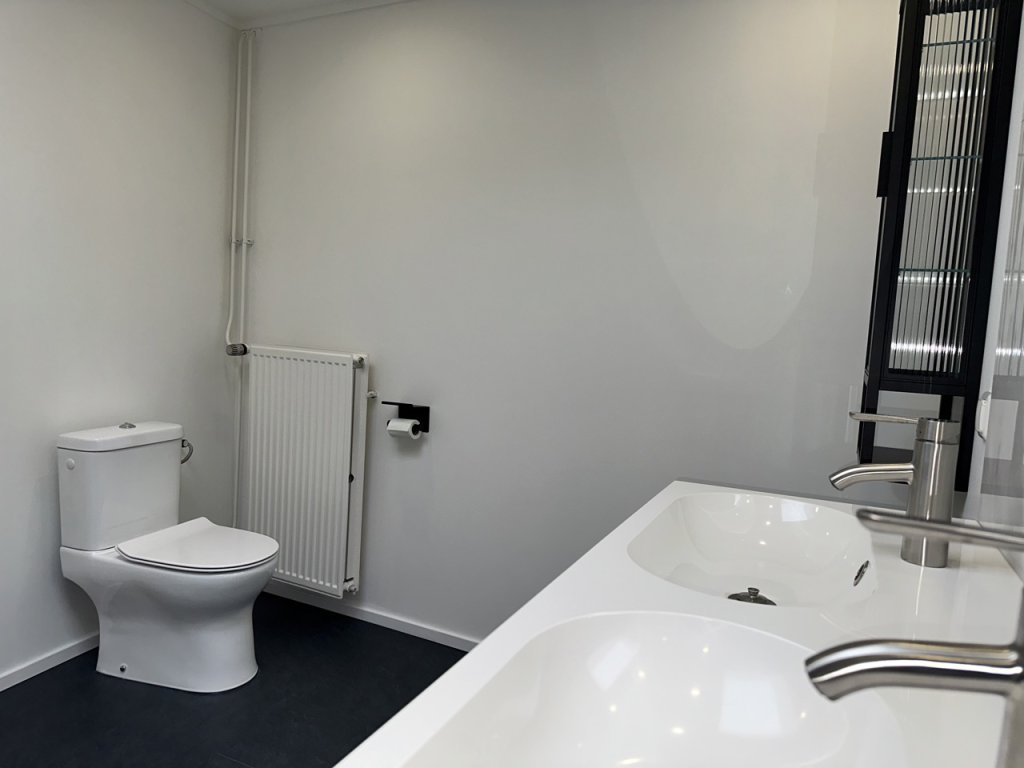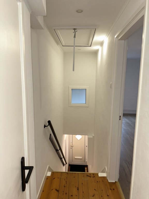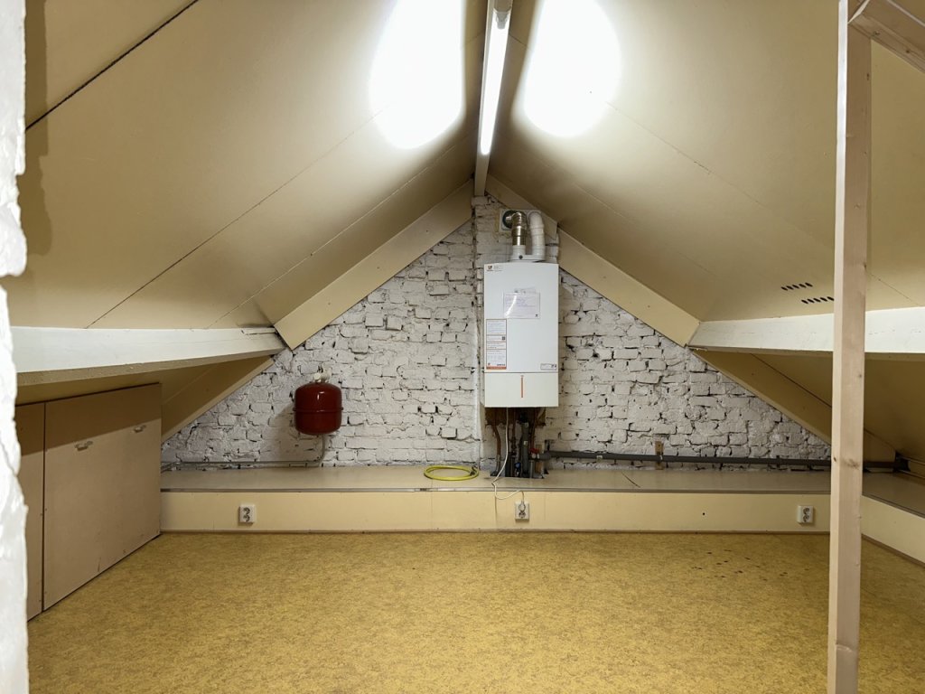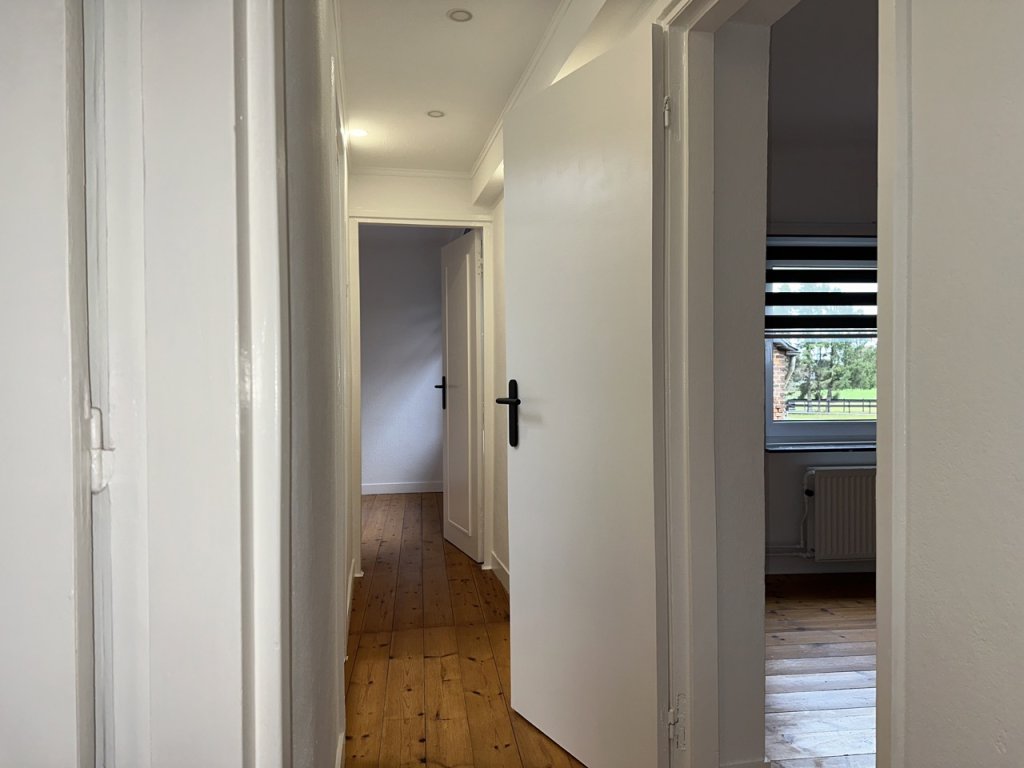 Vanaf de trap kom je op de eerste verdieping op de overloop terecht. Vanuit hier stap je zo de drie slaapkamers in, ideaal als hoofdslaapkamer en twee kinderkamers. De hoofdslaapkamer is zelfs zo ruim dat deze tegelijk zou kunnen dienen als study. Deze kamer krijgt veel lichtinval vanaf de straatkant. De andere 2 ruime slaapkamers zijn gesitueerd aan de achterkant van de woning. Deze hebben dan beiden uitzicht op de tuin en op de weiden achter de woning. De badkamer is compleet gerenoveerd en van alle gemakken voorzien. Ook komt er in deze ruimte veel lichtinval vanuit de lichtkoepel. De badkamer is uitgerust met een dubbele wastafel, toilet en douche. Vanaf de overloop is er ook een vlizotrap naar de zolder - genoeg bergingsruimte!