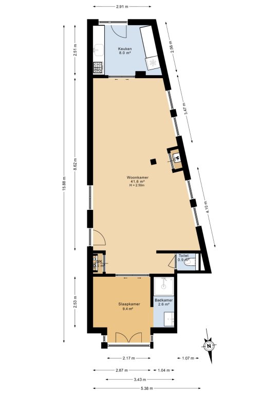 - Badkamer, voorzien van inloopdouche en wasmeubel.