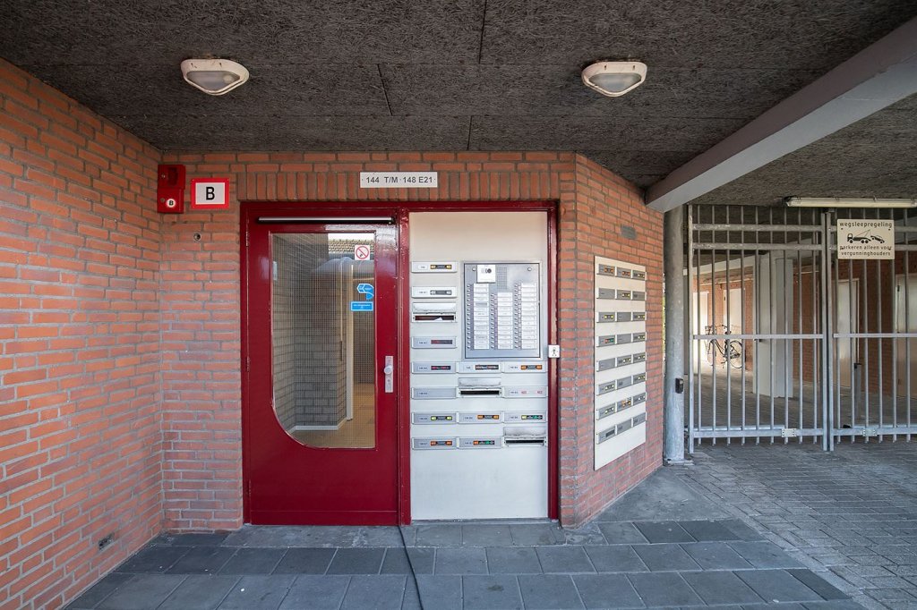 Centrale ontvangsthal met brievenbussen, bellentableau, trappenhuis en lift. In de hal van het complex bevindt zich ook de meterkast.