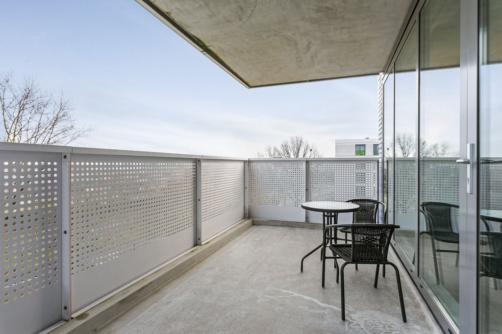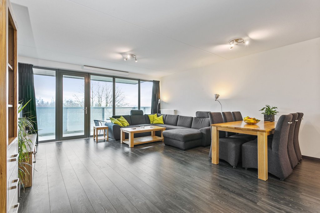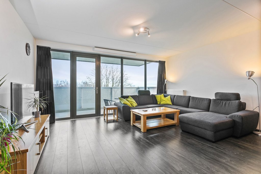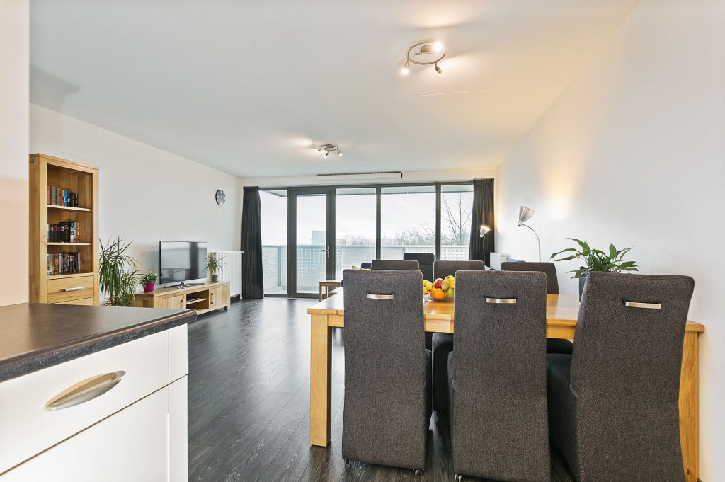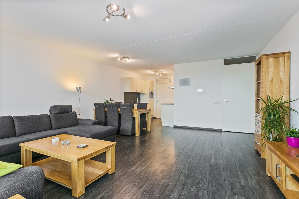 De ruime woonkamer heeft veel lichtinval door de grote raampartij. Vanuit de woonkamer is er middels loopdeur toegang tot het grote balkon van circa 13m2. Vanaf het einde van de middag tot aan zonsondergang kunt u genieten van de zon. Het balkon is niet gekoppeld aan een ander balkon, waardoor het volledig vrij is en u geen directe buren heeft.
