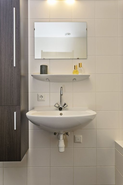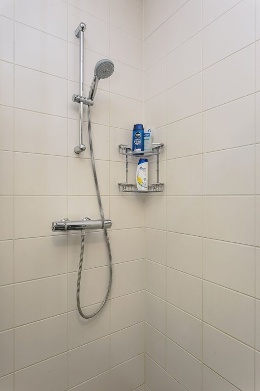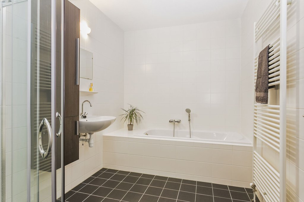 De badkamer is heel compleet ingericht met een inloopdouche, een ligbad, een wastafel en een designradiator. Doordat de badkamer een grote oppervlakte heeft is er meer dan voldoende ruimte, ook als meerdere mensen tegelijk gebruik maken van de badkamer. Er is in de hal een separaat toilet.