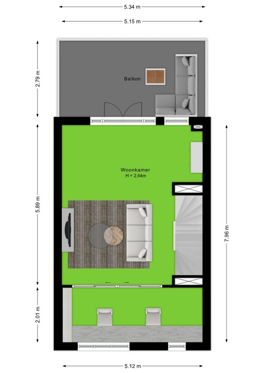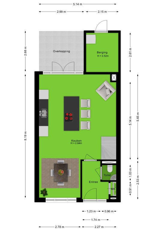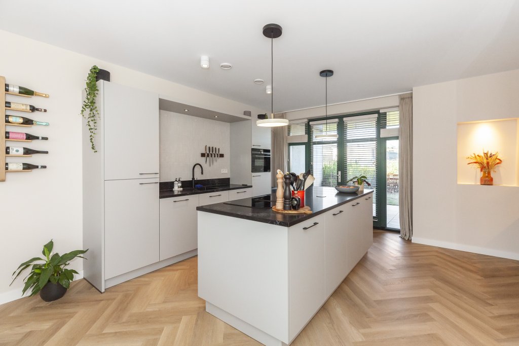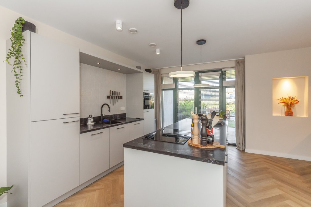 De begane grond is voorzien van een mooie pvc-vloer met vloerverwarming. De hal geeft toegang tot de meterkast, het toilet en de leefkeuken. De moderne leefkeuken bestaat uit en wandopstelling en een kookeiland. De wandopstelling is voorzien van een koelkast, een oven, een magnetron en verschillende kasten en lades. Het kookeiland is voorzien van een inductiekookplaat met integrale afzuiger en verschillende lades. De leefkeuken geeft toegang tot de trapopgang naar de eerste verdieping en via de dubbele openslaande deuren heb je toegang tot de tuin.