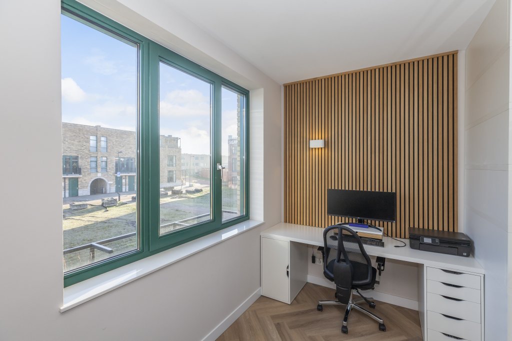 De eerste verdieping is ook voorzien van een mooie pvc-vloer. De woonkamer is ruim, open en licht en geeft toegang tot de trapopgang naar de tweede verdieping, de werkkamer en via de dubbele openslaande deuren kom je op het terras. De werkkamer is gelegen aan de voorzijde van de woning en betreed je d.m.v. de glazen schuifdeuren, dit is een ideale plek om thuis te werken. Het grote terras is gelegen aan de achterzijde van de woning, op het westen, en voorzien van beplanting en neutrale terras tegels.