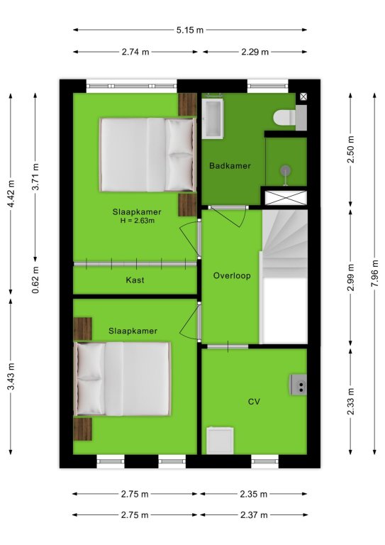 De overloop geeft toegang tot 2 slaapkamers, de badkamer en een berging. Slaapkamer I is gelegen aan de voorzijde van de woning en is voorzien van vaste kasten. Slaapkamer II is gelegen aan de achterzijde van de woning. De moderne badkamer is volledig betegeld en voorzien van een inloopdouche, wastafel met meubel en een zwevend toilet.