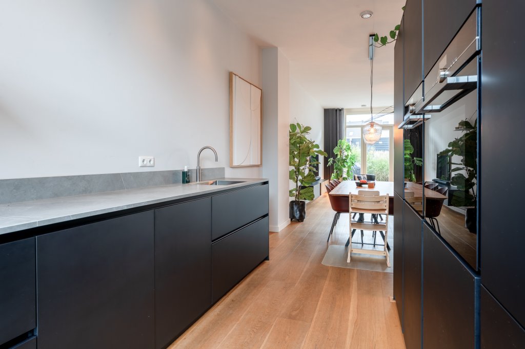 Via de entree kom je in een comfortabele woonkamer met naar de tuin veel glas en dubbele tuindeuren. De trap naar de eerste verdieping is in de hal. De begane grond is met 3 meter extra hoog. De begane grond is voorzien van een mooie vloer in een houtkleur. De keuken is gewoon een plaatje en voorzien van alle apparatuur.