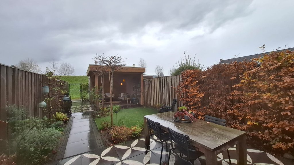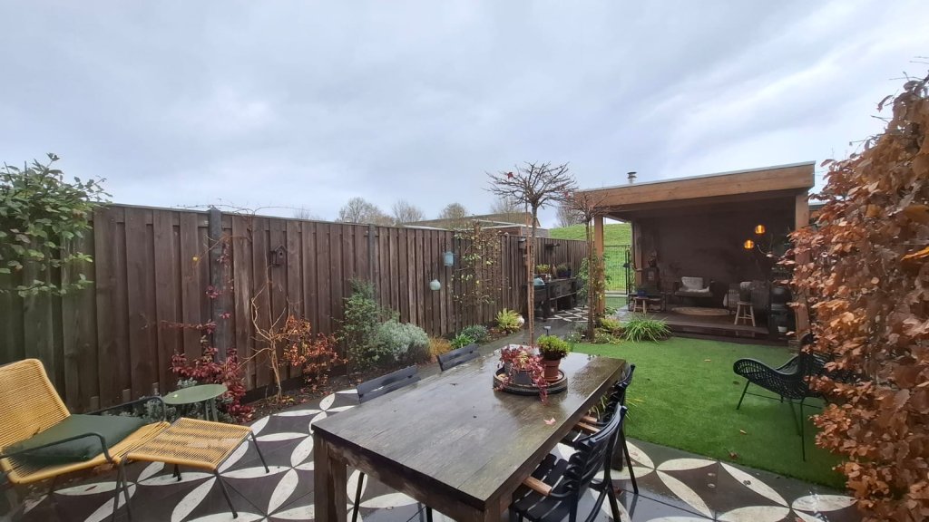 De achtertuin is verzorgd aangelegd met een combinatie van bestrating en groen. Achterin bevindt zich een berging en een praktisch achterom. De overkapping zorgt voor een fijne plek om het hele jaar door buiten te zitten, met voldoende ruimte voor zowel een loungehoek als een eettafel.