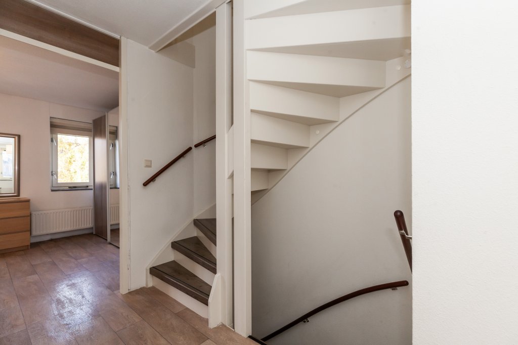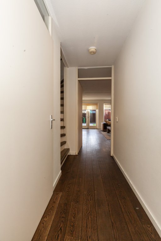 Entree, hal met toilet, meterkast en trapopgang. Er is een lichte woonkamer v.v. parketvloer (en een convectorput) met zicht op de achtertuin. In de woonkamer is ook een trapkast met veel bergruimte.