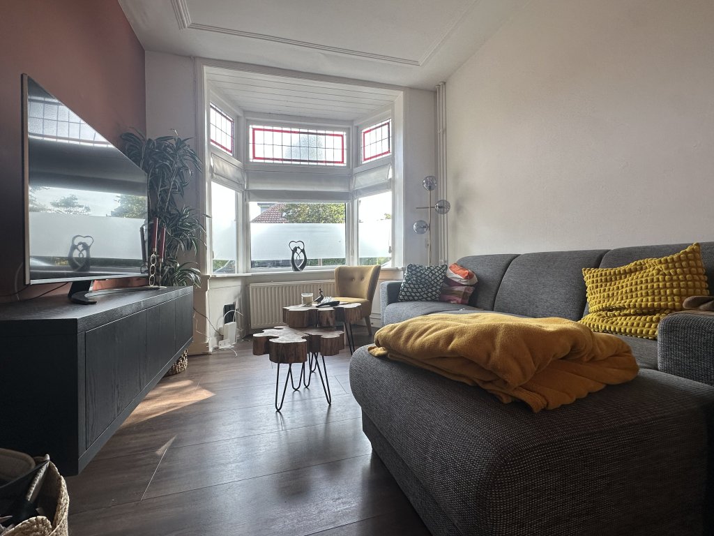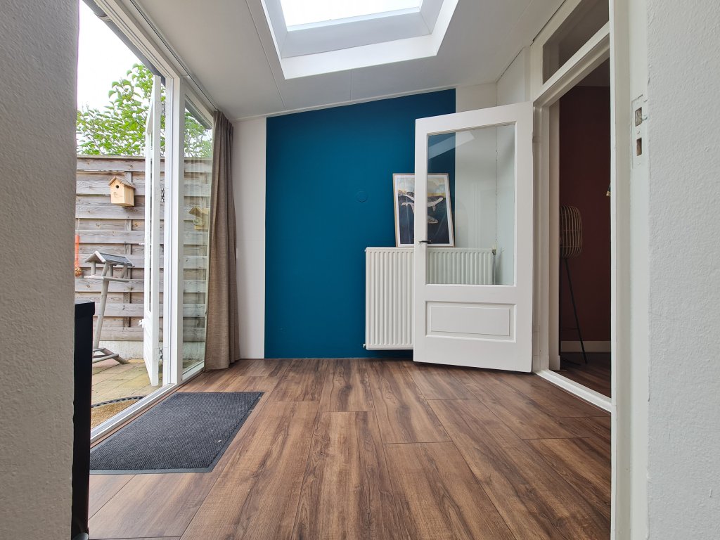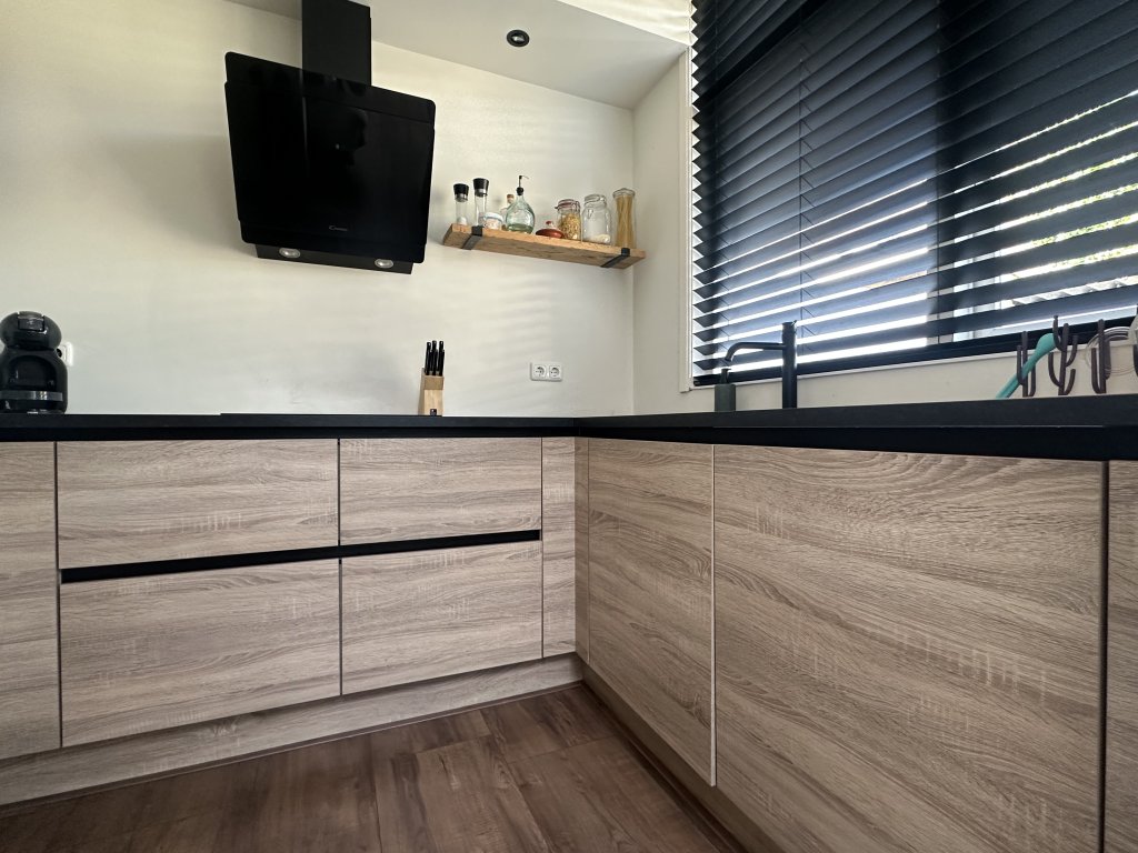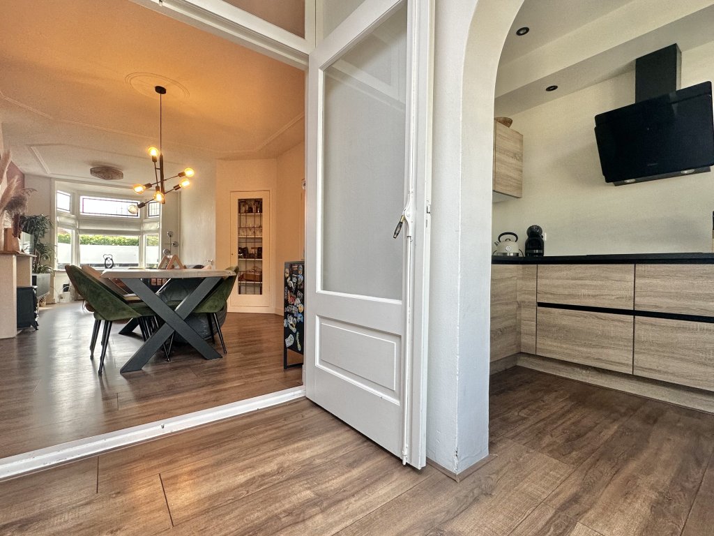 De sfeervolle woonkamer beschikt over een laminaatvloer en strakke wand en plafondafwerking. De erker met glas in lood en de behouden haard maakt het geheel tot een warme, sfeervolle ruimte. Aan de achterzijde kom je door twee deuren in de uitbouw, welke toegang verleend tot de tuin met schuurtje en halfopen keuken. De keuken is voorzien van een keramische kookplaat, afzuigkap, koelkast, combi oven en vaatwasser.