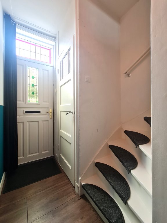 Entree, hal met toegang naar het toilet, inloopkast met wasmachine aansluiting en trapopgang naar eerste verdieping.
