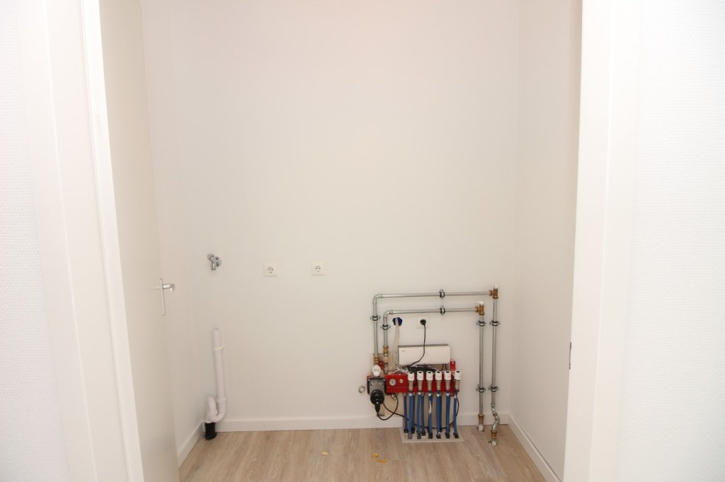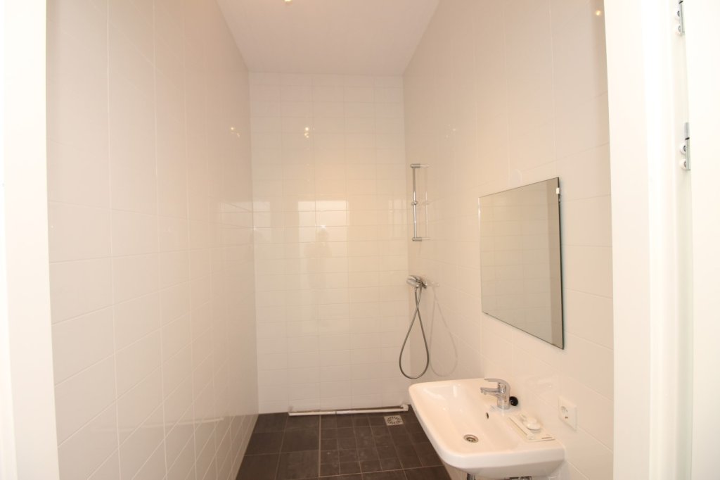 De gloednieuwe badkamer is stijlvol afgewerkt en voorzien van een wastafel en een ruime douche. Daarnaast is er een separaat toilet in de hal aanwezig, wat extra comfort biedt.